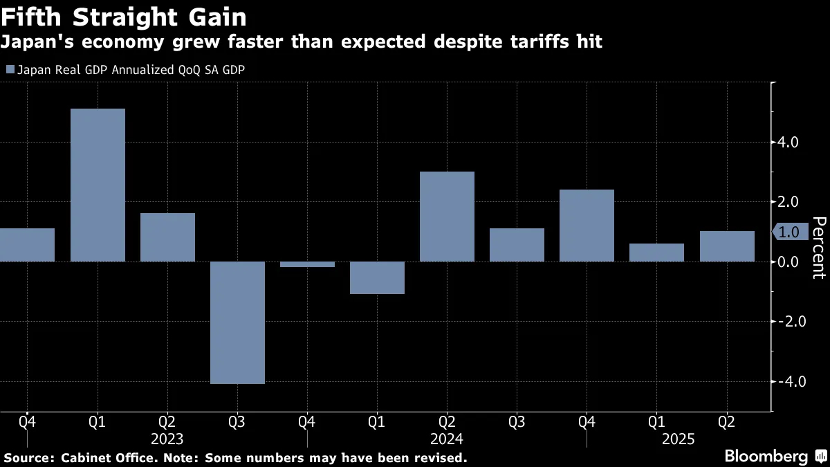 在此背景下,4月至6月期間經濟展現的韌性將為石破提供政治緩衝。由於民眾對生活成本持續上漲普遍不滿,其執政聯盟在上月參議院選舉中失去了多數席位。截至目前,石破已拒絕黨內要求其辭職的呼聲。