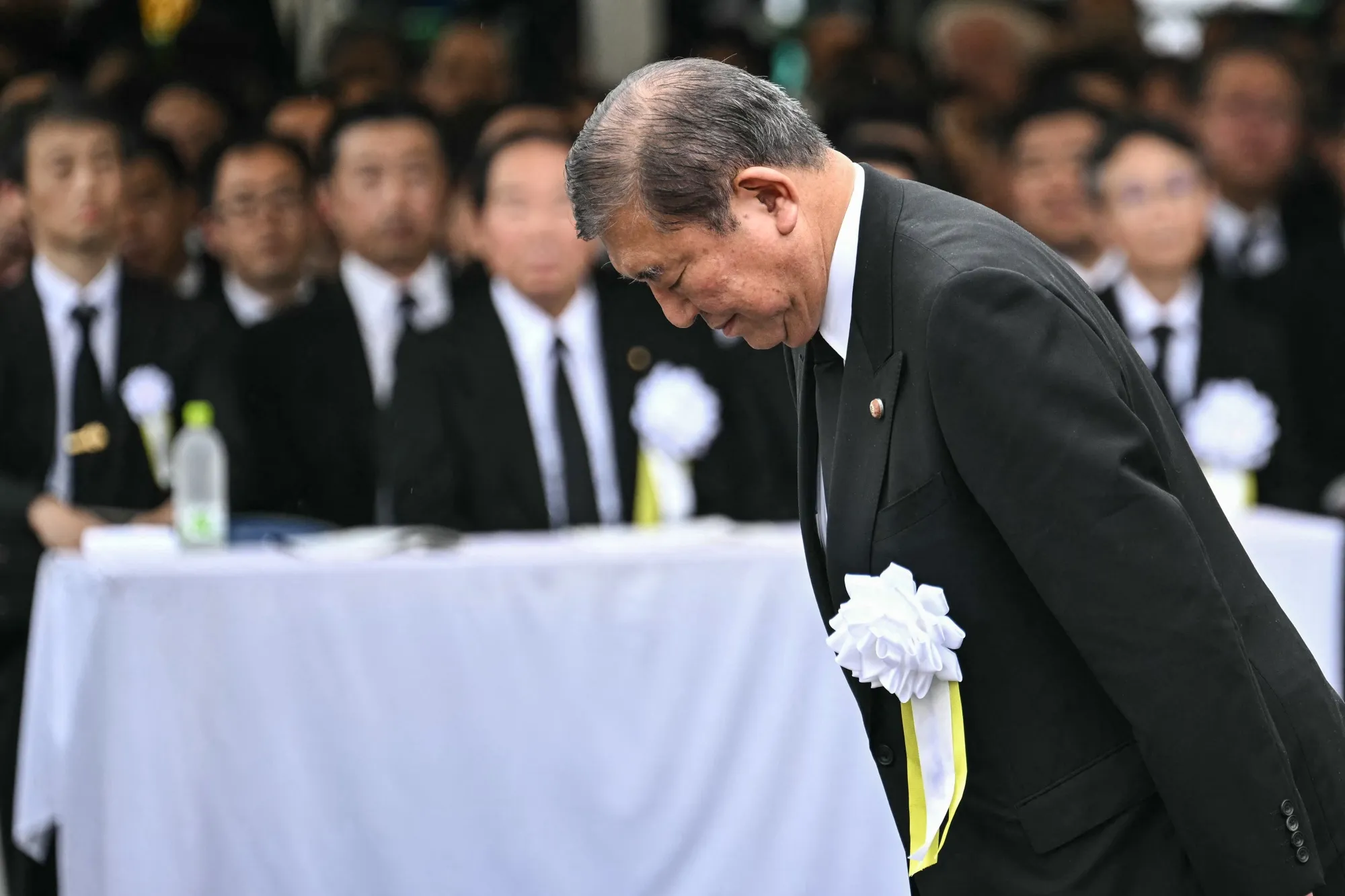 2025年8月9日,日本首相石破茂在長崎和平公園舉行的原子彈爆炸80週年紀念儀式上鞠躬致哀。