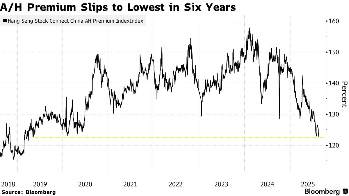 資金湧入推動恒生中國企業指數年內累計上漲24%,成為全球表現最佳的股指之一。南向資金同時將恒生AH股溢價指數壓制至2019年以來最低水平,該指數追蹤的A股相對H股溢價率目前已收窄至22%。