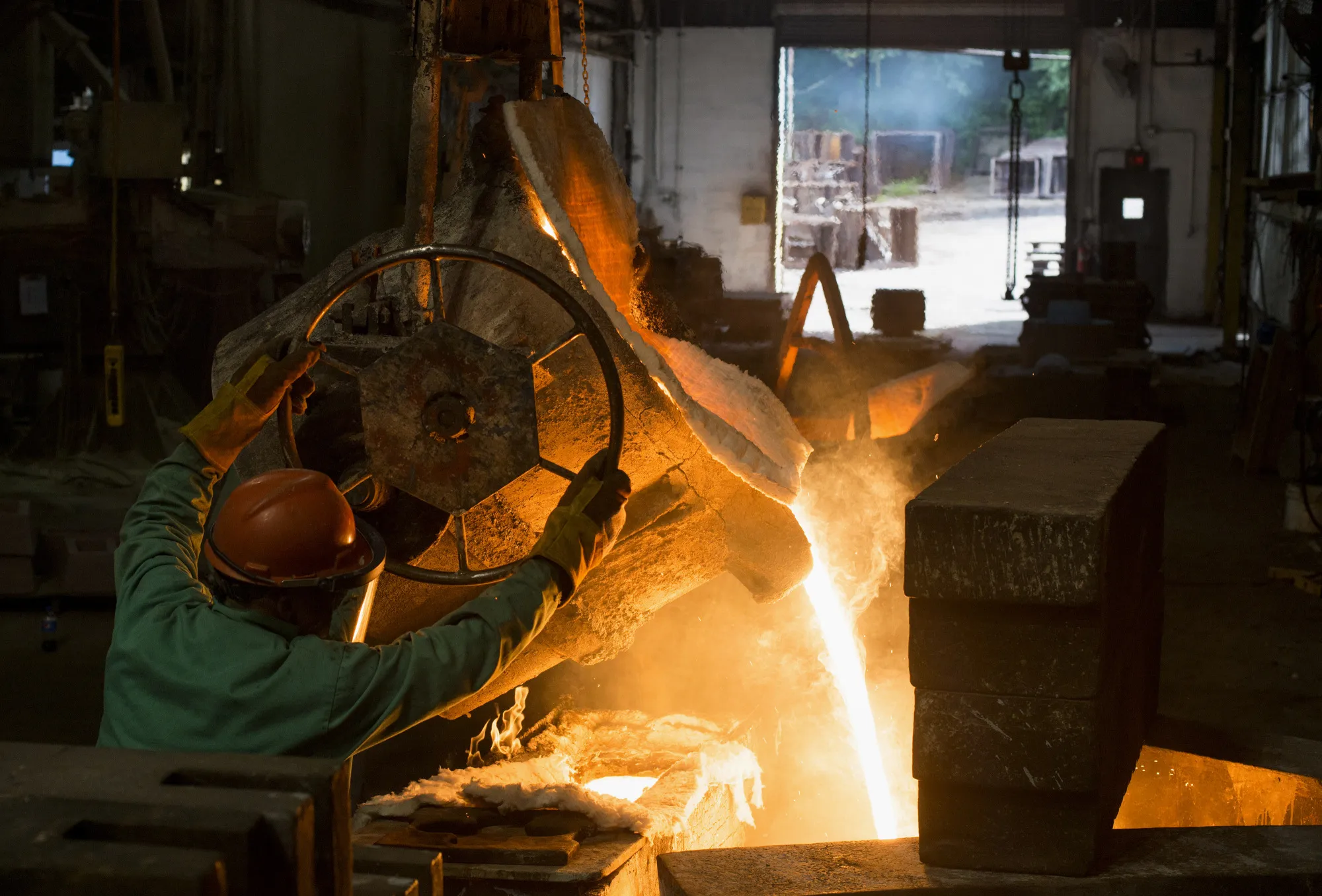 美國俄亥俄州塞勒姆市,一名工人正將熔融金屬從熔爐倒入大型鋼包中。