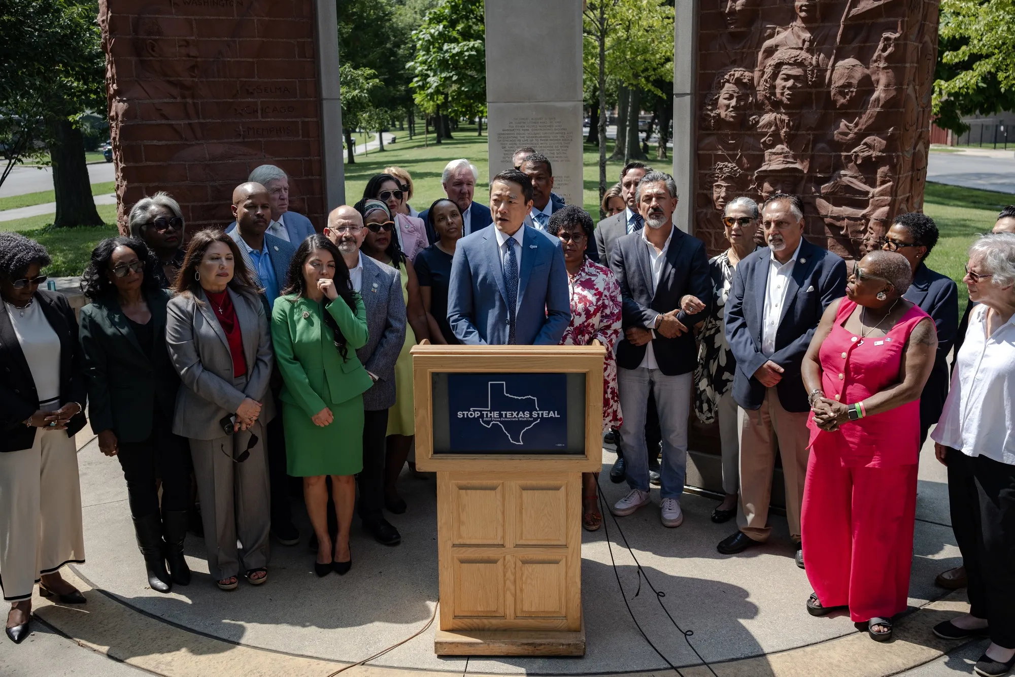 8月13日,德克薩斯州眾議院民主黨核心小組主席吳元之在芝加哥馬凱特公園馬丁·路德·金紀念園舉行的新聞發佈會上發言。