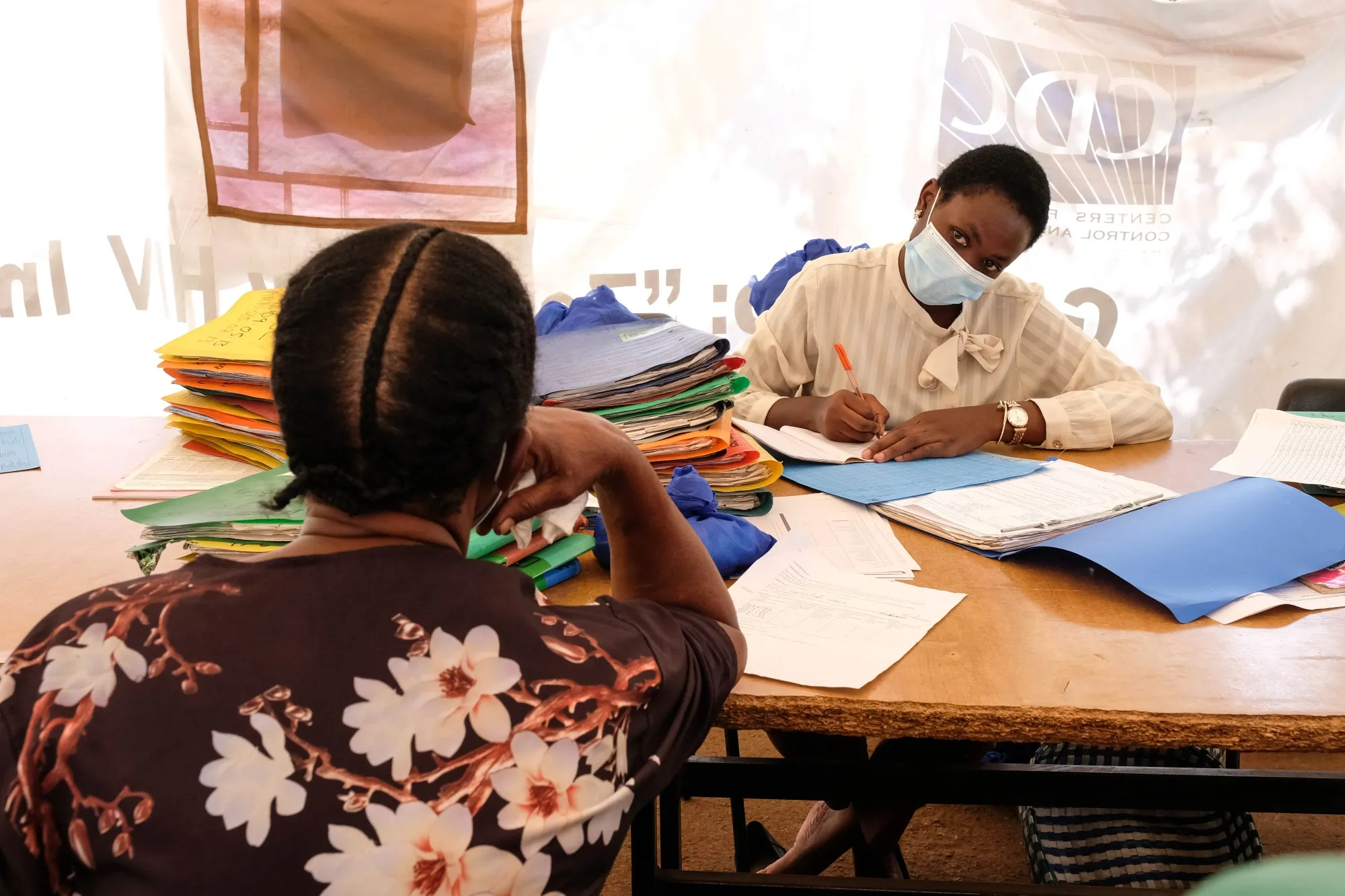 在烏干達坎帕拉的一個服務中心,一名諮詢師在艾滋病診所日活動中從客户那裏獲取信息。