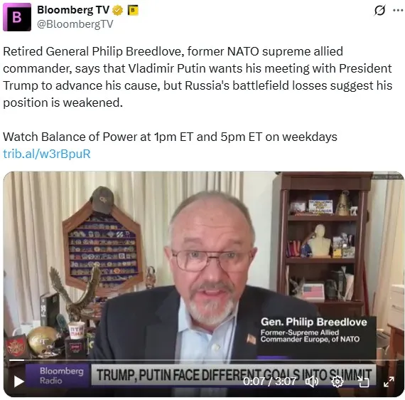 今天下午1點,彭博電視台《權力平衡》早間版節目中,主持人喬·馬修採訪了北約前最高盟軍指揮官菲利普·布里德洛夫退役將軍,探討特朗普與普京會晤之際烏克蘭的實地局勢。