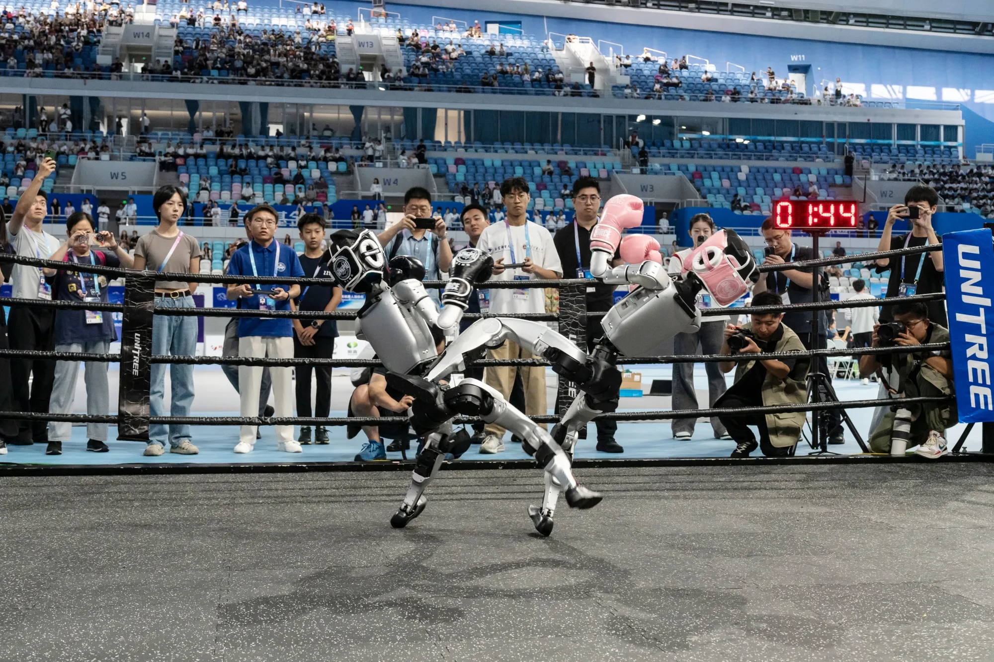 宇樹科技人形機器人在搏擊比賽中對抗。攝影師:沈起來/彭博社在國家速滑館中央搭建的拳擊台上,來自當地高校的參賽者讓宇樹G1型號機器人相互較量。這些通過彩色頭帶和拳套區分的機器人,以踢擊和擺拳動作引發觀眾驚歎。