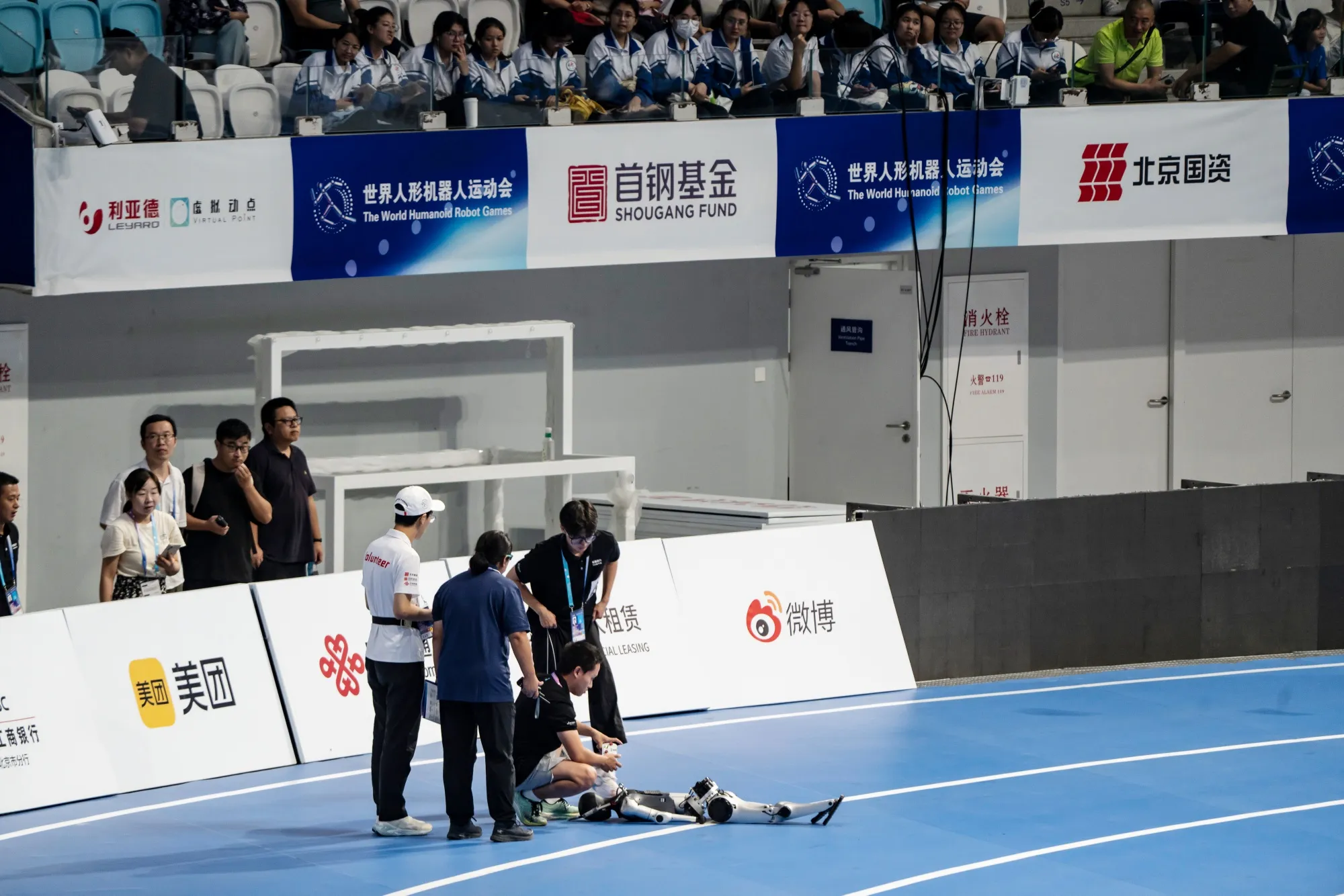 技術人員在1500米比賽中處理故障人形機器人。攝影師:沈啓來/彭博社