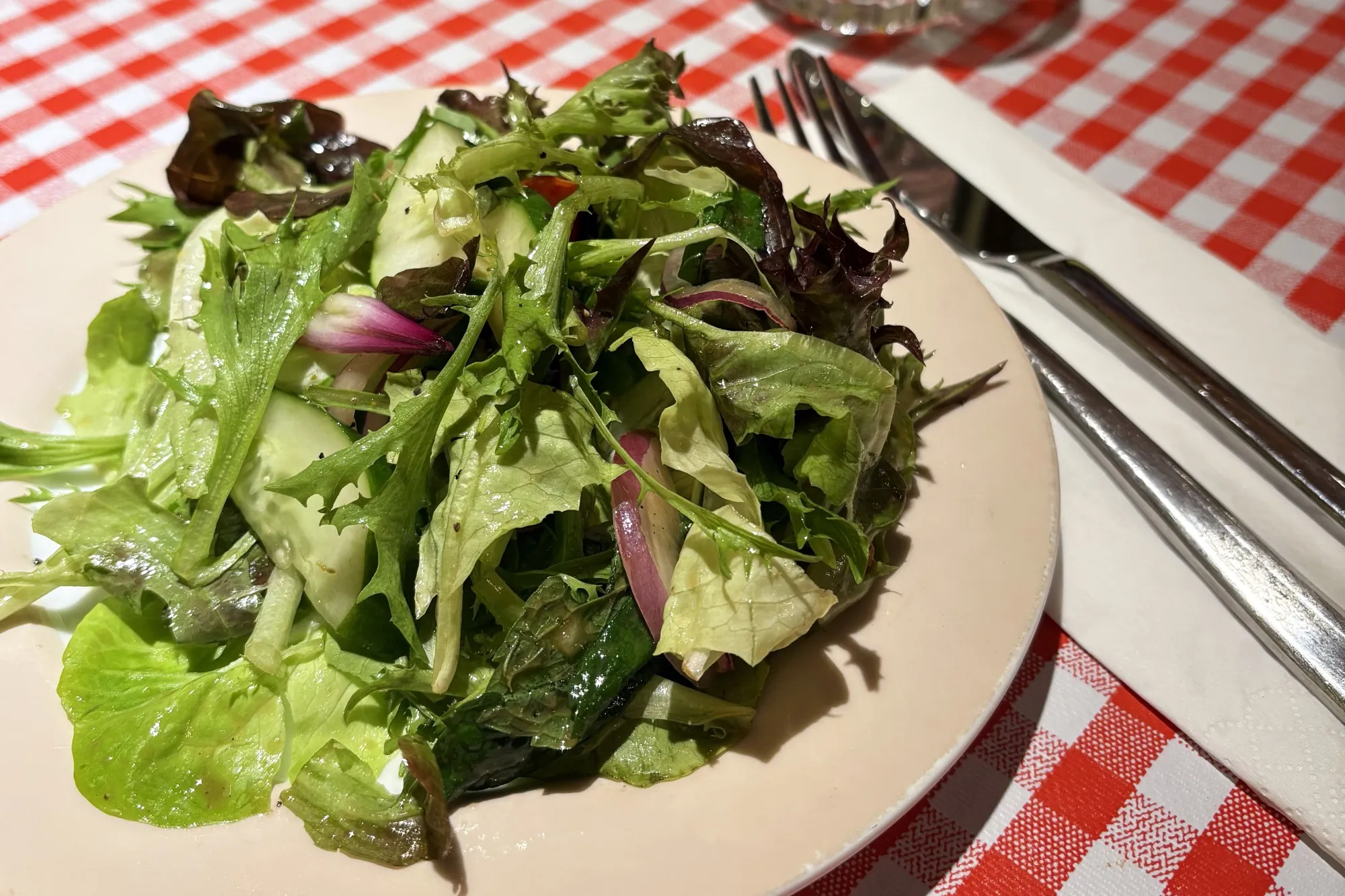 午市套餐包含特色福利:油醋拌混合蔬菜無限量供應的沙拉,以及略幹但美味的蒜香麪包(無妨,它可是清理醬汁的完美工具)。我們另點了提拉米蘇(28港元),與其他菜品一樣採用家庭式砂鍋盛裝,還獲贈清爽的檸檬酒,正好化解這頓豐盛餐食的油膩感。