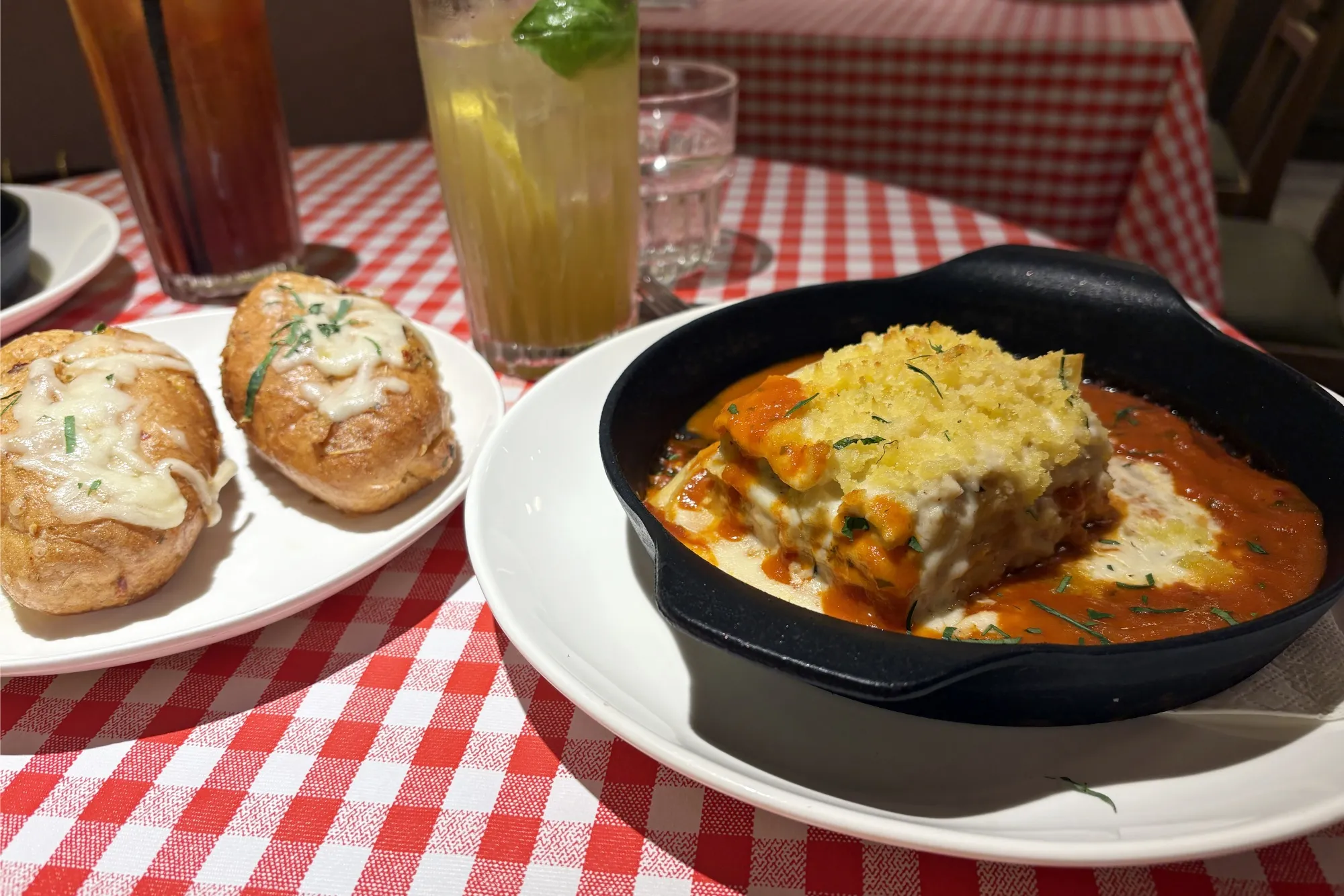千層麪工廠的蟹肉千層麪與蒜香麪包。攝影師:Raymond Schillinger/Bloomberg兩款千層麪均鋪在新鮮番茄醬上,滿載傳統風味——雖不及祖母手藝,卻也足以喚起懷舊之情。酥脆的芝士麪包屑外皮與下層柔軟面片形成絕妙對比。