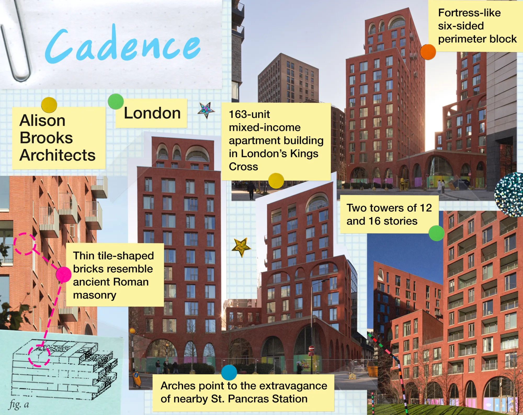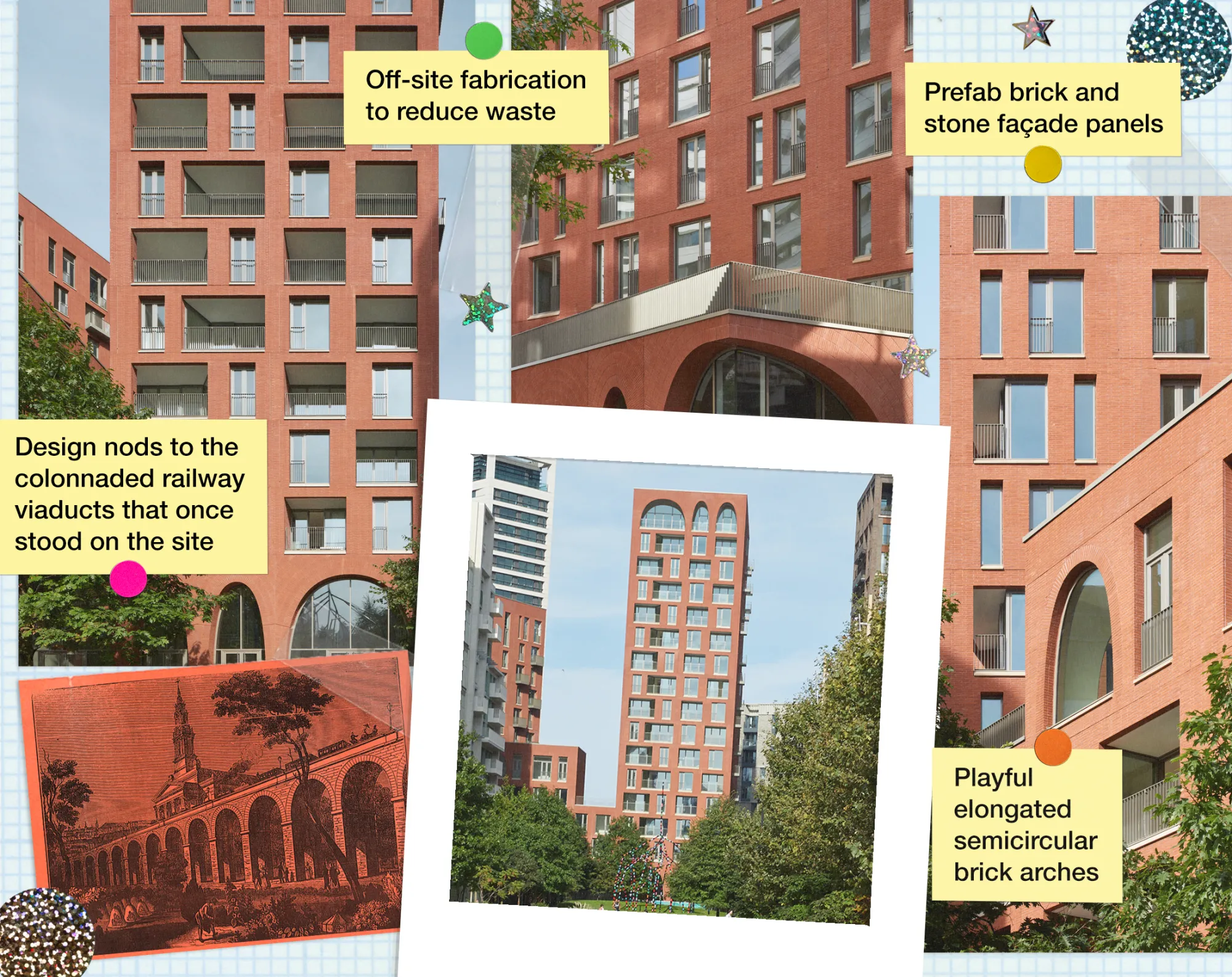 熟悉該區域的人一眼就能看出"韻律"紅磚拱廊的設計靈感——它致敬了聖潘克拉斯車站華麗的新哥特式站台建築(該綜合體正建於其舊貨場原址)。2007年車站為歐洲大陸列車擴建改造前,其壯觀的柱廊式高架橋曾橫跨現今"韻律"所在地,這些高架橋的拆除令許多倫敦人扼腕。布魯克斯向彭博CityLab證實,建築中對這些高架橋的神韻再現確屬刻意為之。