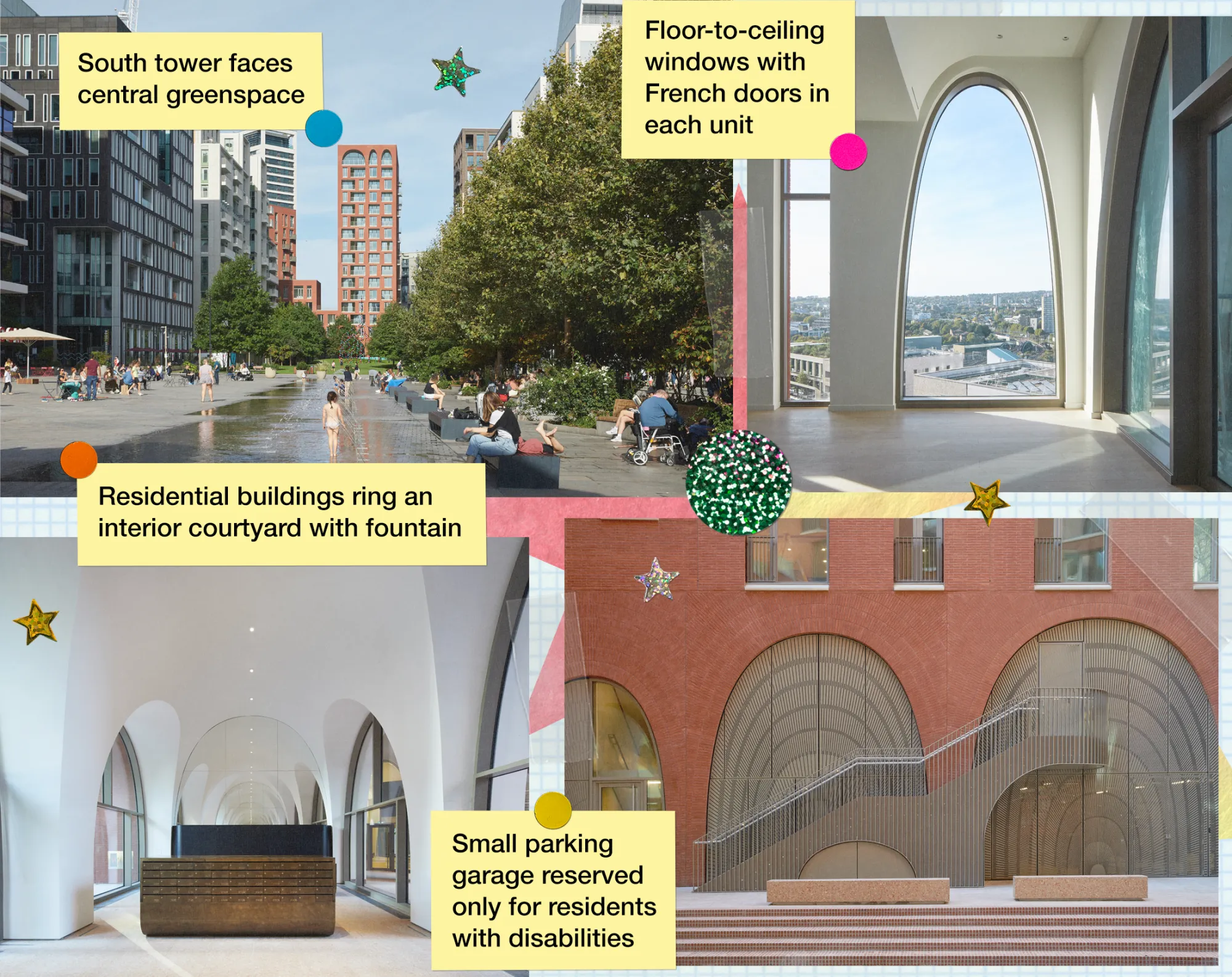 圖片來源:埃德蒙·薩姆納/保羅·裏德爾/莎拉·舒馬赫 彭博社在如此侷促的高規格地塊上,交付大量可售面積的壓力不言而喻。這或許解釋了——除了顯著的可持續性優勢外——為何凱登斯項目僅在小型車庫內設置殘疾人車位。不過建築整體避免了為追求極限容積率可能帶來的單調感,轉而採用鋸齒狀輪廓:高低錯落的迷你塔樓環繞着宮殿式內庭院,樓宇間留有充足間隙,部分空間被屋頂平台佔據。