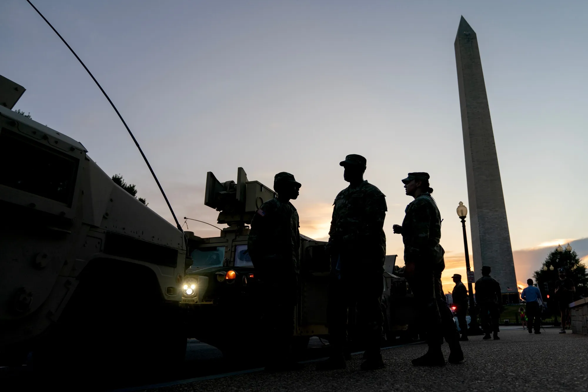 8月12日,華盛頓紀念碑附近部署的國民警衞隊成員與裝甲車輛。