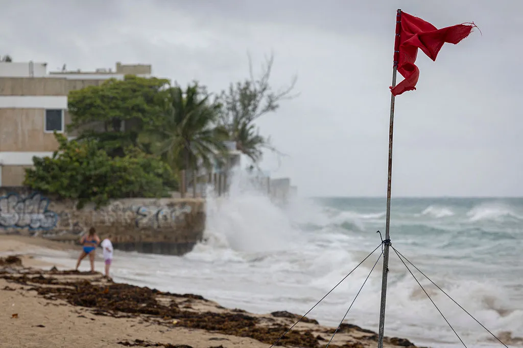 8月16日,波多黎各聖胡安,隨着颶風"艾琳"逼近,警示離岸流危險的紅旗正在飄揚。