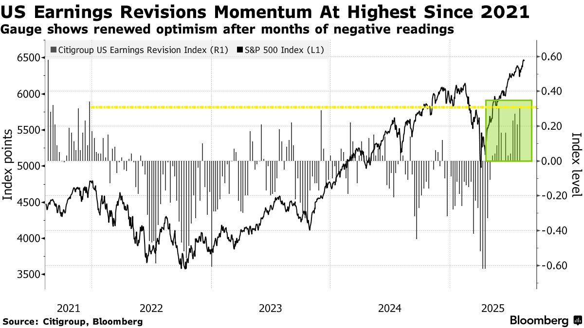 花旗集團編制的一項指數顯示,美國企業每股收益預估上調與下調的相對數量比已達到2021年12月以來的最高水平。這種趨勢在近期發佈自身前景展望的公司中同樣顯著。彭博行業研究數據顯示,將企業預測與華爾街共識預期進行比較的前瞻指引指標,目前徘徊在近四年來的第二高位。