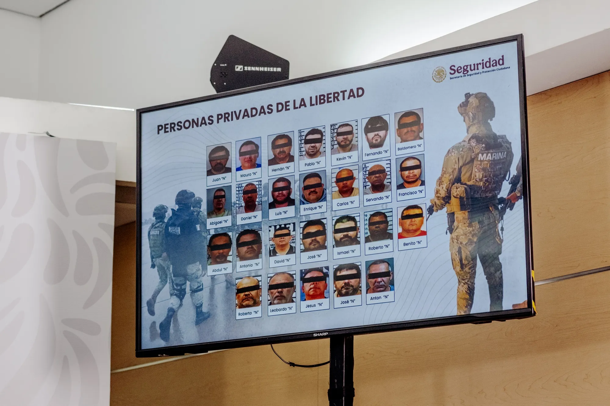 8月13日墨西哥城新聞發佈會現場屏幕顯示26名因販毒指控被引渡至美國的嫌犯。攝影師:弗雷德·拉莫斯/彭博社今年二月,希恩鮑姆批准了非常規引渡程序將墨西哥大毒梟移交美國受審。另一批毒販已於上週移交給美方。