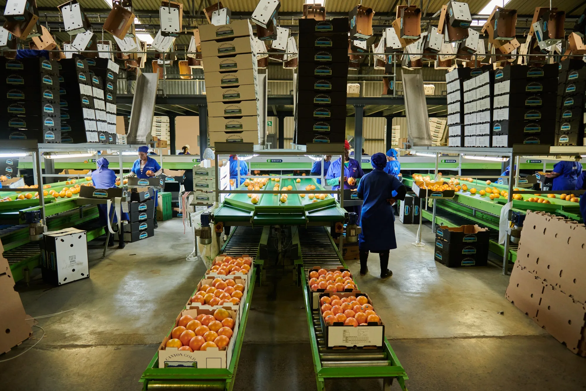 南非霍德斯普雷特郊外柑橘農場,工人們正在裝箱葡萄柚。