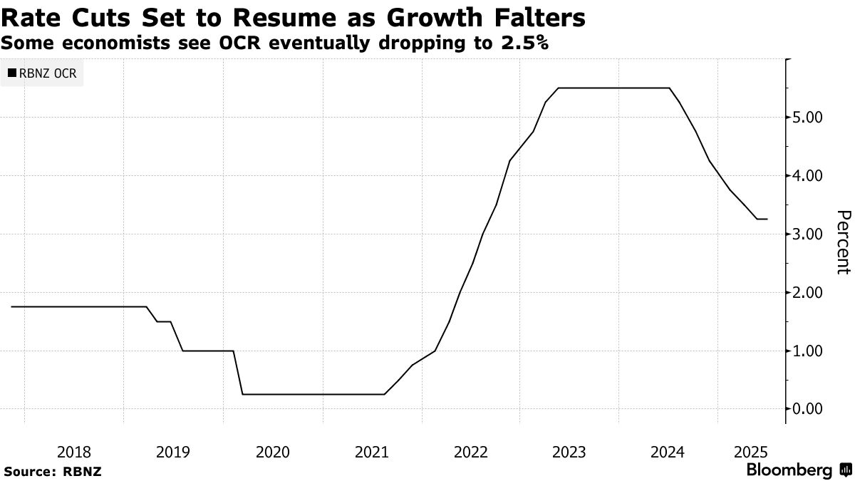 新西蘭央行上月維持利率不變以評估通脹上升,但政策制定者預計將把重點轉向經濟增長疲軟。隨着失業率上升和房地產市場持續疲軟,新西蘭消費者信心下降,而企業則因美國關税引發的全球貿易緊張局勢而保持謹慎。