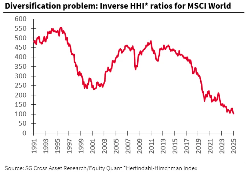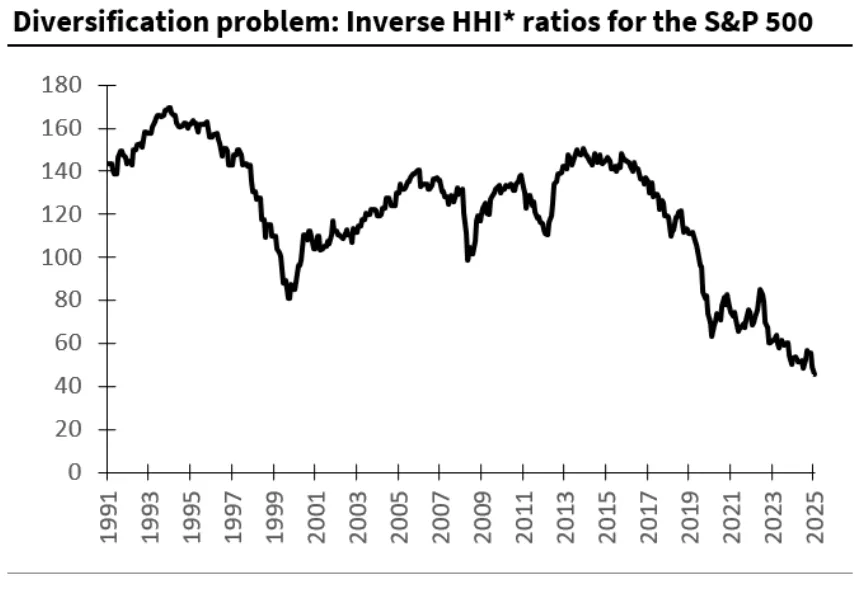 這對被動投資者構成難題,因為買入指數基金已無法分散風險。這些圖表展示了赫芬達爾-赫希曼指數的倒數——反壟斷監管機構常用該統計指標衡量行業集中度,其數值等同於達到指數分散效果所需的個股數量。目前,複製MSCI全球指數分散度僅需100支股票: