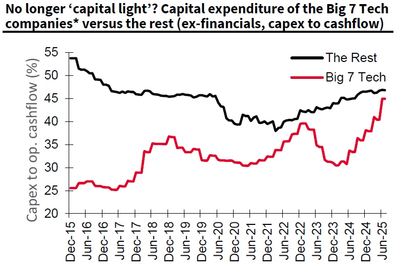 大型科技集團的燒錢速度也遠超歷史水平。這是新現象。科技行業通常是"輕資產"的。但為支持AI所需的算力基礎設施和能源的資本支出激增,使得這些公司的投資規模幾乎相當於其他所有公司的總和**:**