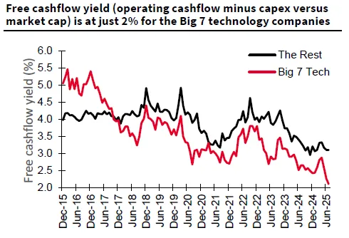 合理配置的資本支出會因利潤增長而自我回收,但這些投入仍需實際發生。與此同時,科技巨頭的自由現金流收益率(運營現金流減去資本支出佔市值的比例)給股票回購或股息分配留下的操作空間極為有限: