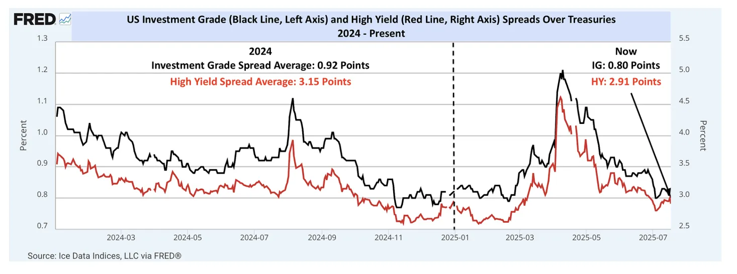 另一個衡量信貸市場脈搏的指標——將投資級債券與高收益債券的利差並列比較——也得出了類似結論。正如DataTrek的尼古拉斯·科拉斯在這張圖表中指出的,公司債券利差遠未達到去年的高點,已從最初的關税衝擊中回落: