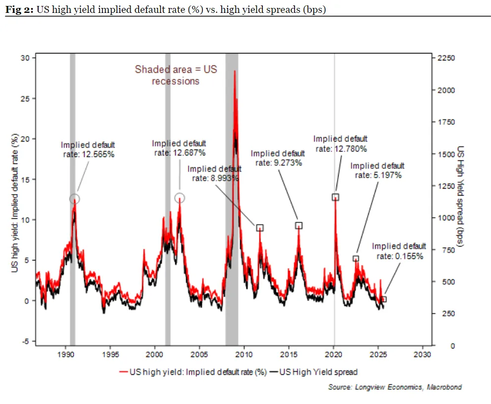 高收益債券利差正以驚人態勢抵抗着特朗普總統重構全球貿易體系的宏大嘗試。隨意加徵的關税威脅着本已微薄的利潤空間,關税推動的通脹可能延長貨幣緊縮週期,推高再融資成本與違約風險。但市場傳遞出完全不同的信號:當前利差水平非但未反映經濟困境,反而預示衰退遙不可期。如龍景經濟學圖表所示,美國高收益債券市場依然強勁,隱含違約率接近零: