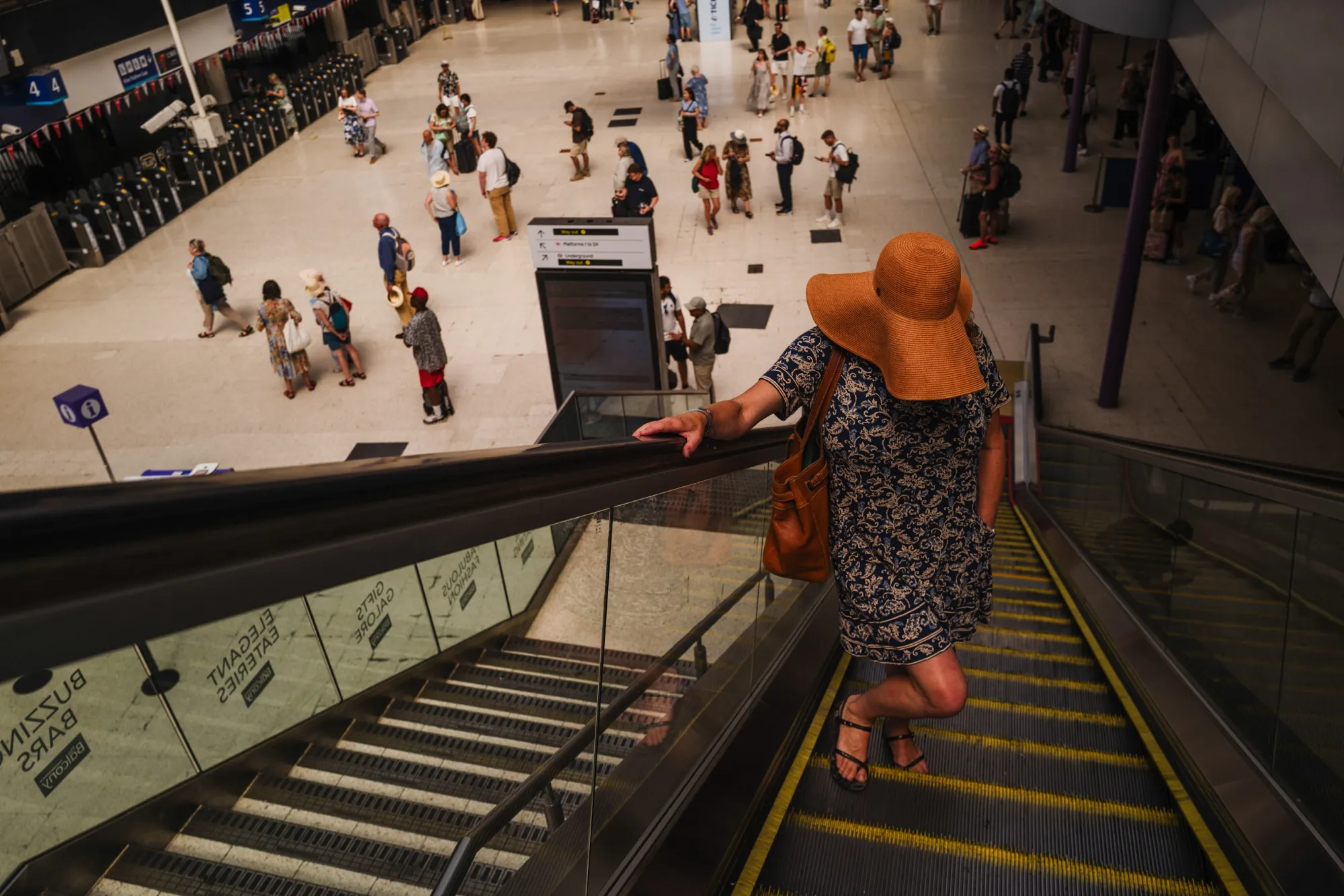 倫敦熱浪期間,高峯時段地鐵上一位手持便攜風扇的通勤者。