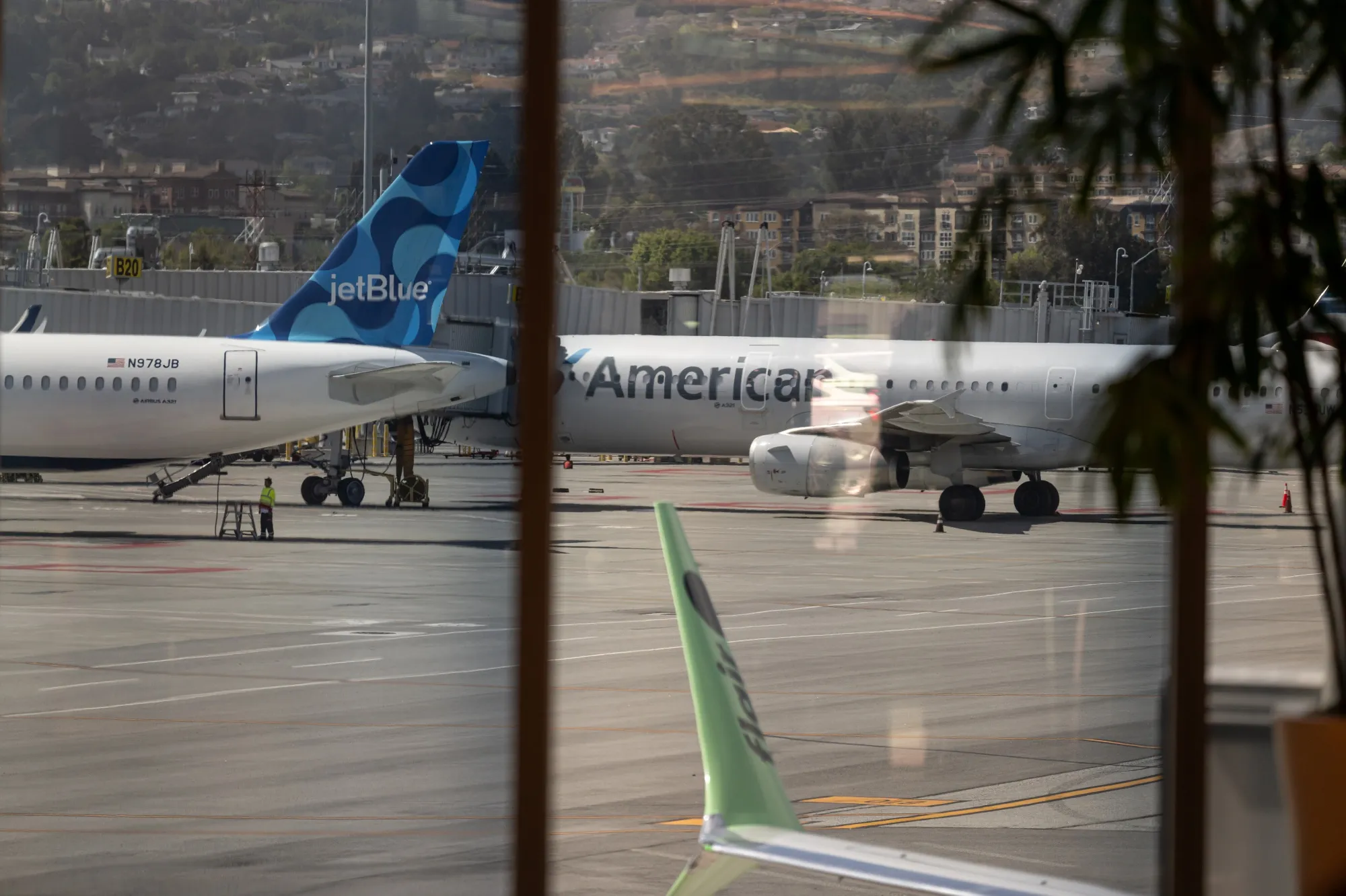 五月舊金山國際機場的捷藍航空和美國航空客機。攝影師:David Paul Morris/彭博社受經濟不確定性衝擊的美國休閒和商務旅客正拖延至最後一刻才預訂機票。