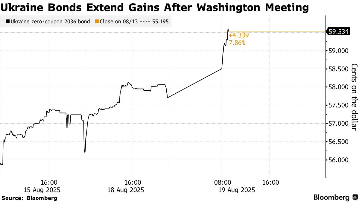 儘管持久和平協議仍面臨障礙,但根據彭博彙編的數據,烏克蘭的美元債券在新興市場中領漲。2036年到期的零息美元債券連續第五天上漲,價格超過面值的59%,達到3月底以來的最高水平。