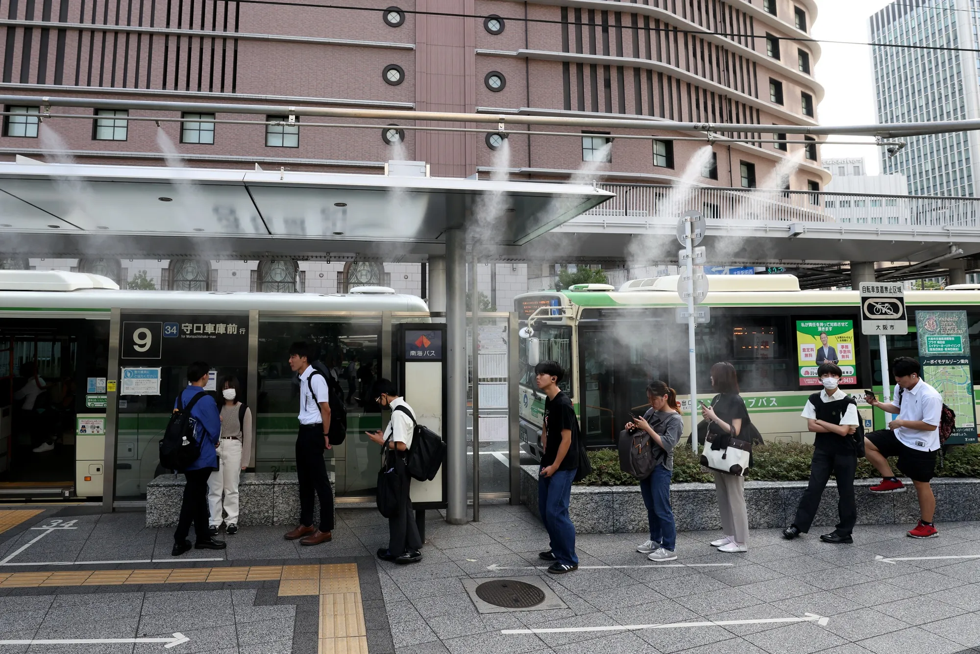 大阪高温期間,清晨通勤者在公交站台享受降温水霧。
