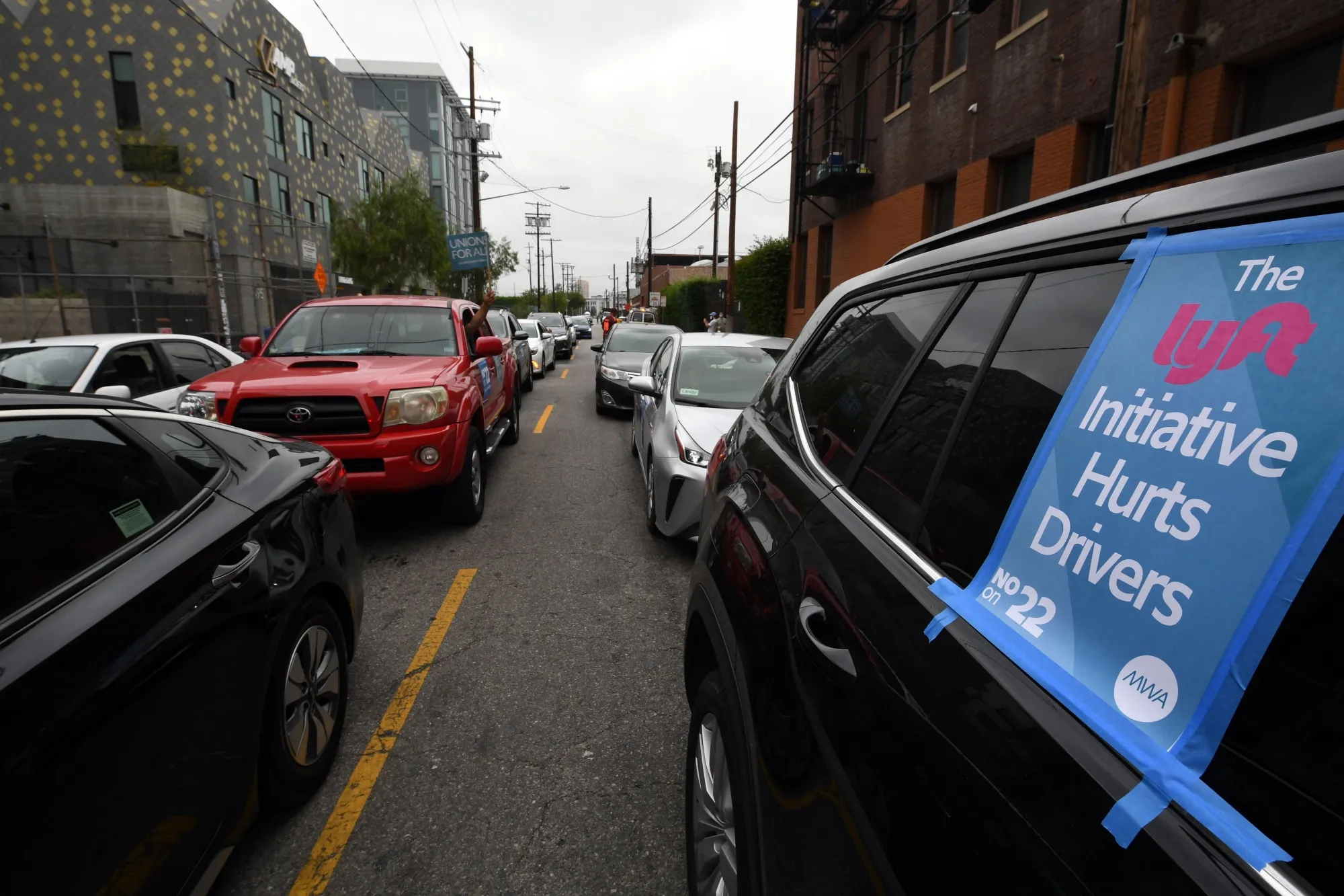 2020年洛杉磯示威活動中司機們舉着標語牌。攝影師:Robyn Beck/AFP/Getty Images"我預計他們會一直籌款到最後一刻,“公投提案專家布蘭登·卡斯蒂略表示,他的公司主導了網約車企業的公投提案。“你只有不到一個月的時間啓動所有廣告宣傳。”