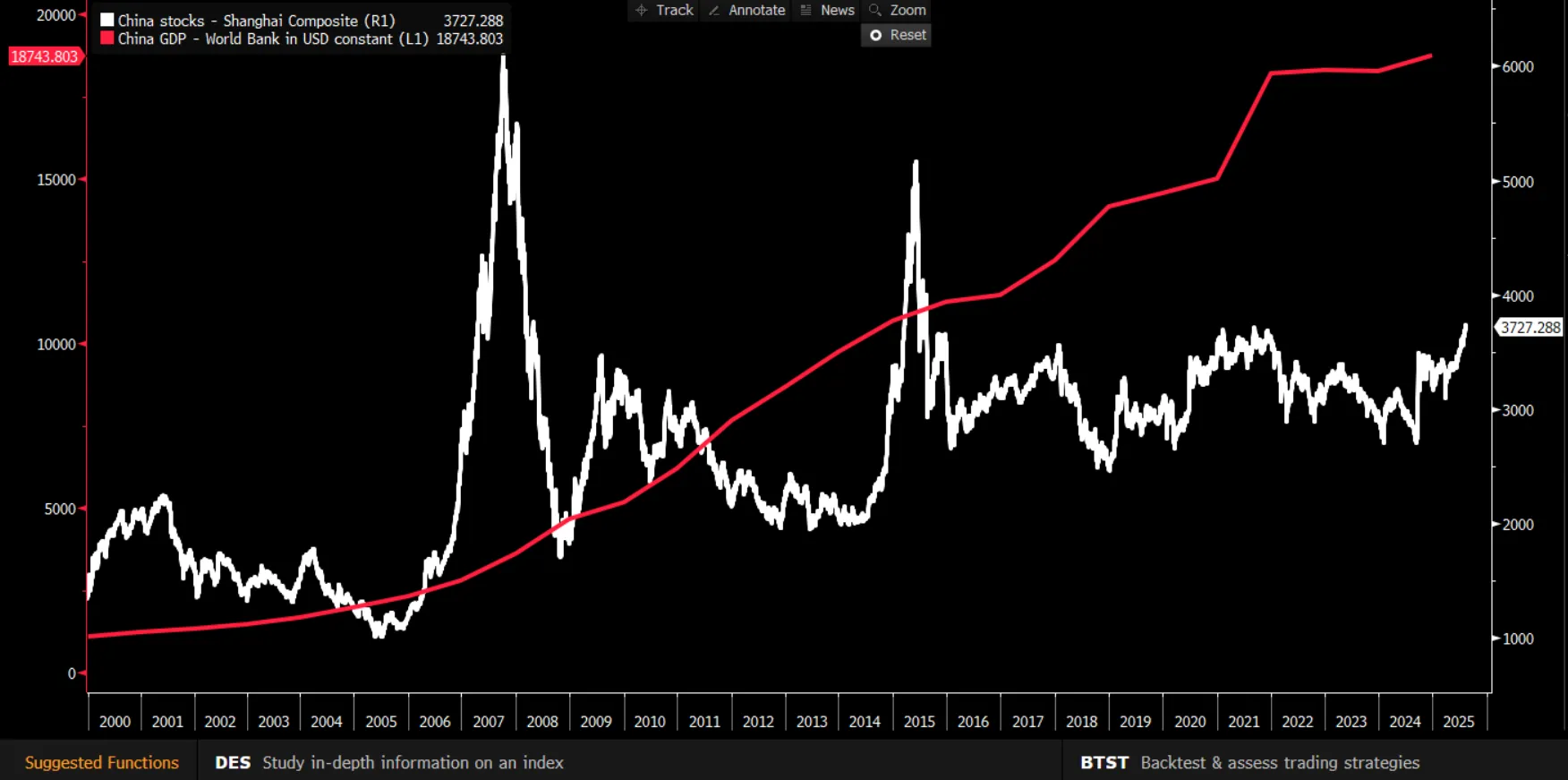 中國的工程雄心往往導致產能過剩問題,如著名的"鬼城"和"無通路橋"現象。股市同樣明顯:儘管我們習慣以GDP衡量中國作為經濟強國的地位,但其股市卻難見這一優勢——由於價格與利潤的無序競爭,十多年來基本處於橫盤狀態。