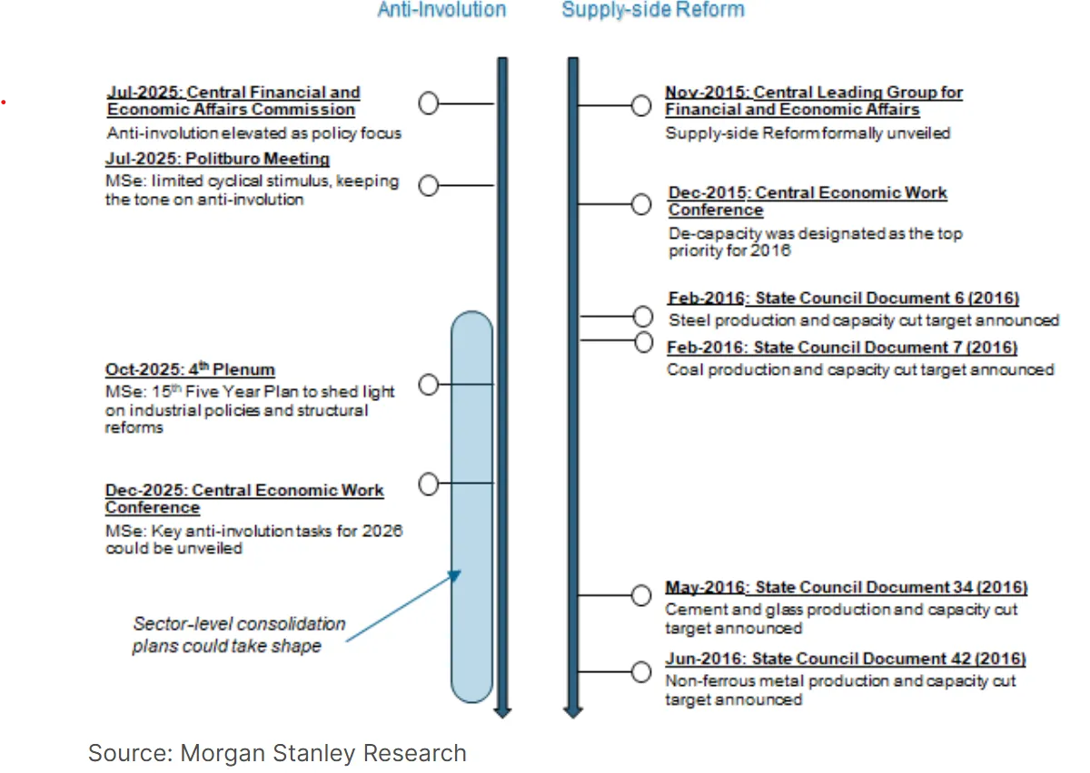 這與中國過去推行的“供給側結構性改革”有相似之處,但也存在關鍵差異。正如摩根士丹利的Chetan Ahya和Rajeev Sibal本週指出的:“反內卷常被比作2015-18年的供給側改革,但如今的產業格局不同,因為新興產業往往由民營企業主導。光伏、電動車和電池等領先行業並非由舊經濟時代的國有企業驅動。當前的產業環境需要通過激勵而非指令來整合供給。”