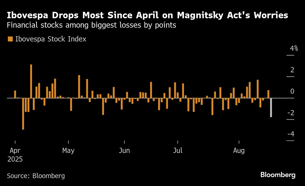 投資者擔心美國政府對巴西最高法院部長亞歷山大·德·莫拉埃斯實施《馬格尼茨基法案》制裁將給金融機構帶來更廣泛衝擊。週一,弗拉維奧·迪諾部長裁定外國政府的司法和行政命令需經巴西批准方可在該國生效。