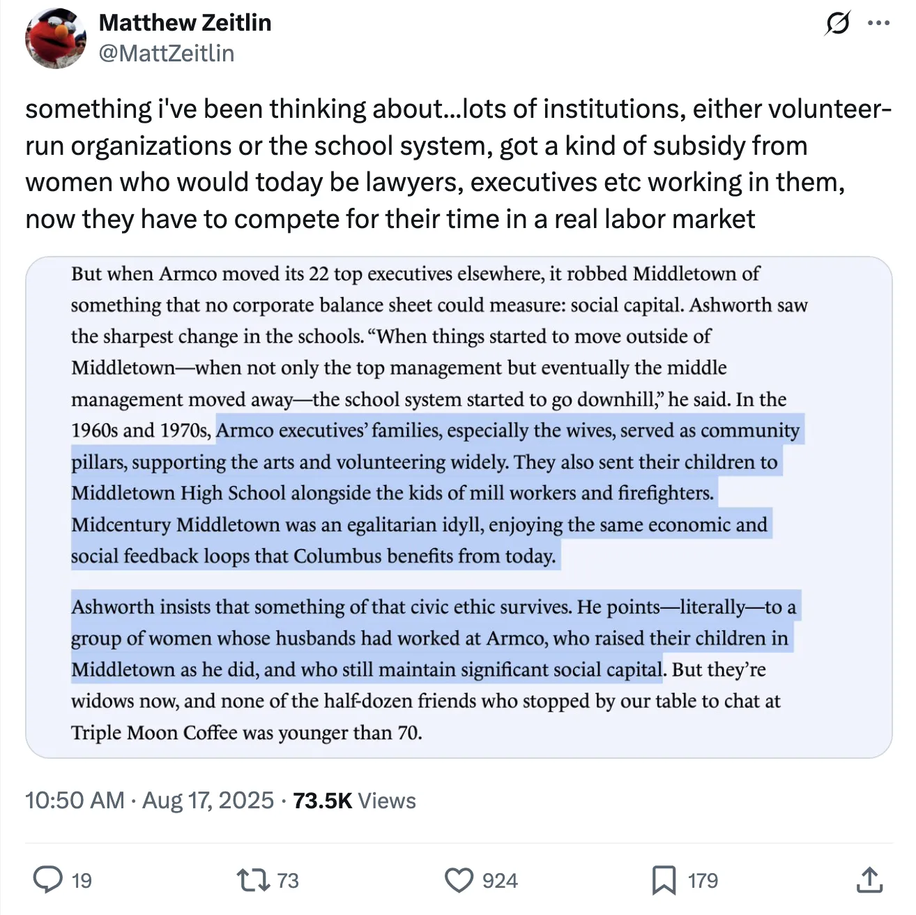實際上,幾個世紀以來女性一直在從事各種無償勞動,其中部分也發生在家庭之外。(少年棒球聯賽中場休息時那些橙子片可不是自己切好的!)數據記者馬修·蔡特林將其稱為某種形式的補貼: