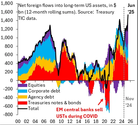 然而美國資產的真實資金流向卻呈現另一番景象。去年股票資金流雖轉為負值,如今已強勢回正。國債流入雖在減少但仍保持正值——不久前新興市場央行還在疫情期間引發資金外流。總體而言,美元資產的資金流入規模空前: