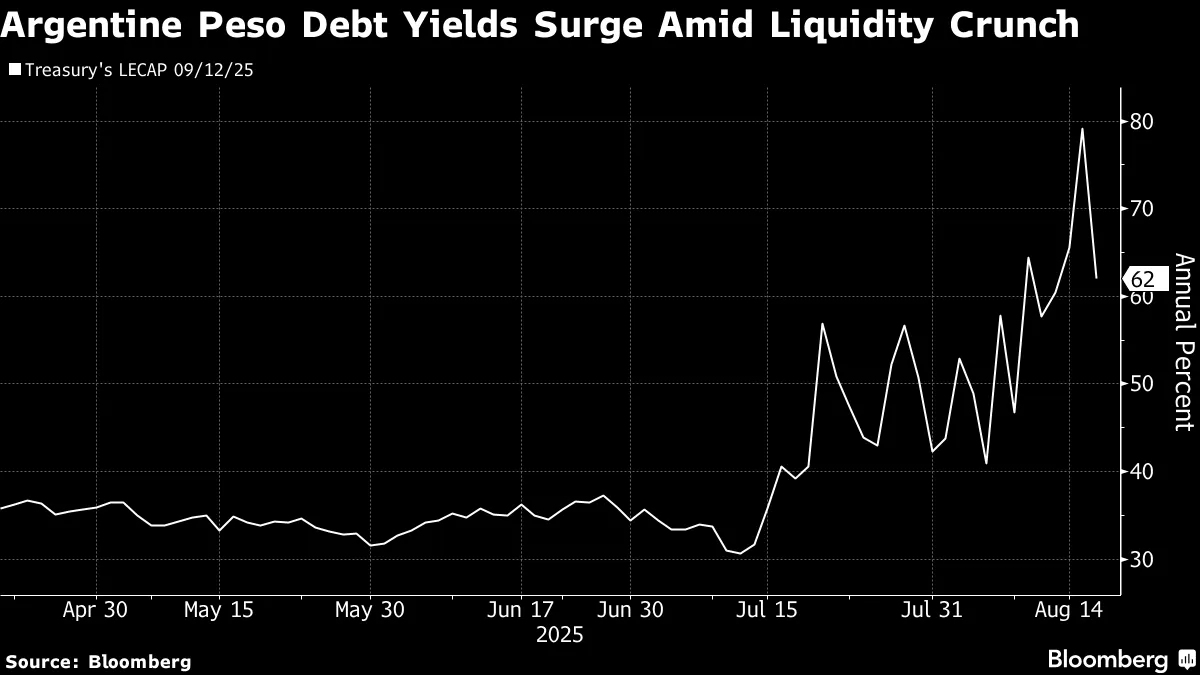 緊張局勢在7月底開始升級,當時政府決定通過出售本幣債券從市場回籠比索,以抑制美元需求。比索匯率上月暴跌超12%,創下米萊總統2023年12月上任後貨幣貶值以來的最差表現。政府措施引發流動性危機,將實際利率推高至兩位數。