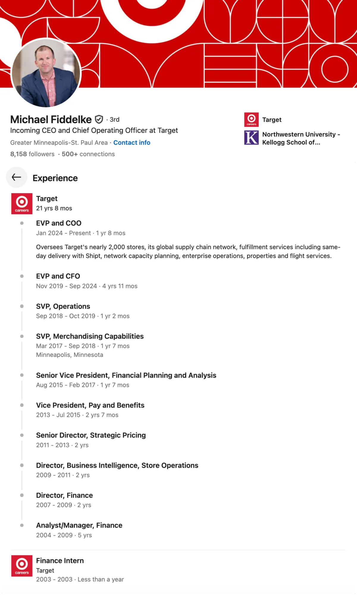 這並非斷言這位財務實習生出身的新掌門註定失敗。“雖然空降者可能為塔吉特帶來新視角,但菲德爾克深諳如何維繫客户關係,“安德莉亞分析道,“他深耕公司二十餘載,歷任財務、門店運營及商品管理要職,見證過輝煌與低谷。事實上,在堅守企業價值觀展望未來時,塔吉特更需要從歷史經驗中汲取智慧。”