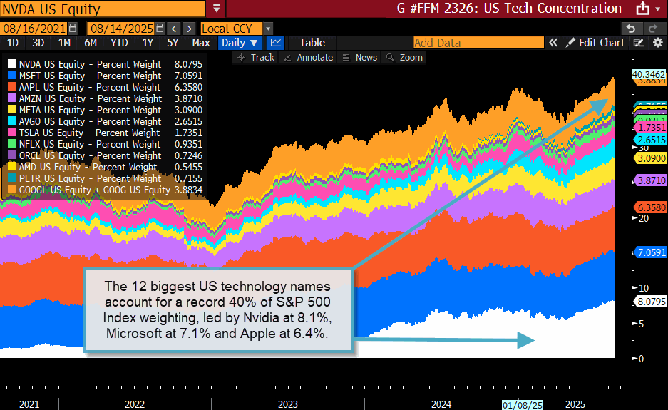 - 十二家科技巨頭——英偉達公司、微軟公司、蘋果公司、亞馬遜公司、Meta平台公司、博通公司、Alphabet公司、特斯拉公司、Netflix公司、甲骨文公司、Palantir科技公司和超微半導體公司——現在約佔標普500指數權重的40%。
