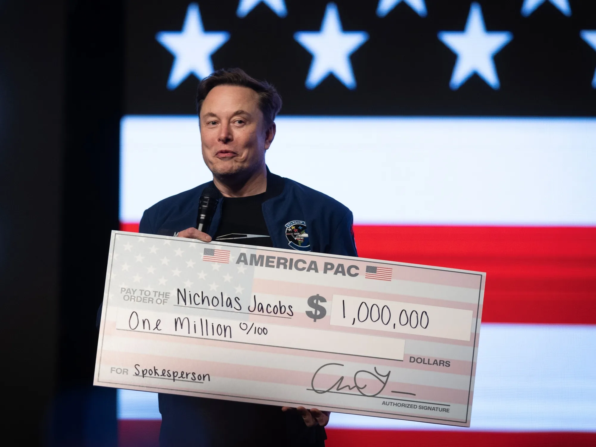 2025年3月,埃隆·馬斯克在市政廳會議上準備向威斯康星州一名選民捐贈100萬美元。
