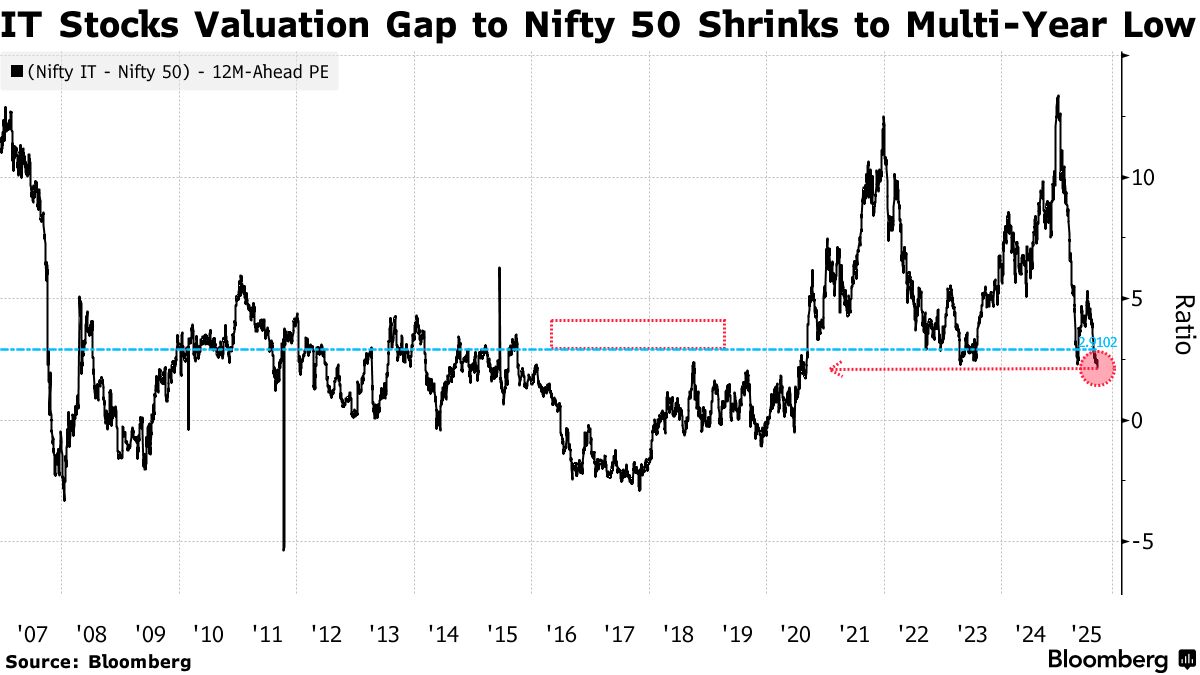 信息技術領域或許暗藏機遇。該行業相對於基準NSE Nifty 50指數的估值溢價已處於五年低點,目前接近20年平均水平——近年來這一水平往往預示着買入時機。雖然營收增長問題依然存在,但該板塊的估值回調標誌着更健康的入場點,尤其是與市場上其他領域過高的市盈率相比時。