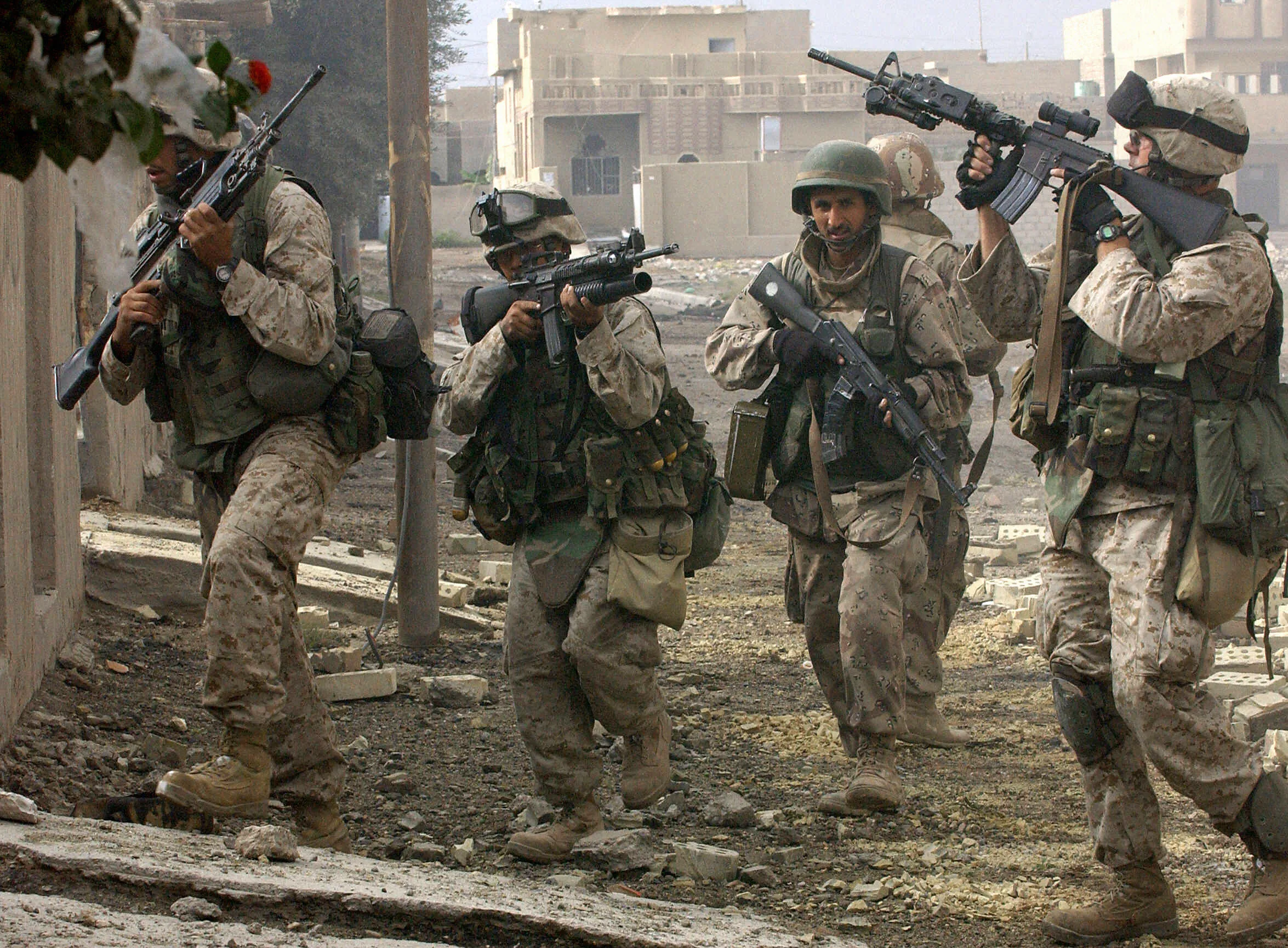 2004年12月,美國海軍陸戰隊在動盪的費盧傑市巡邏。
