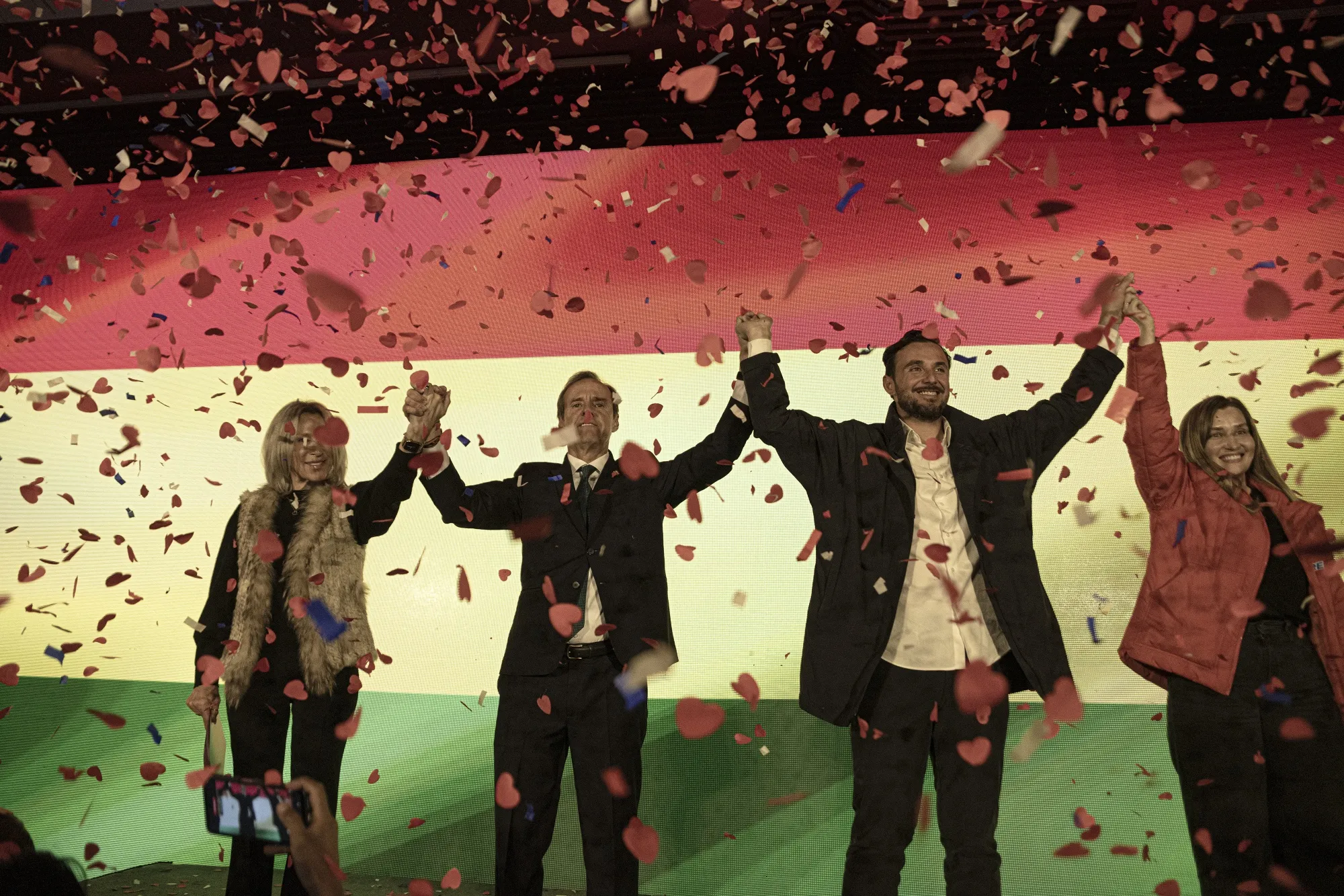 自由聯盟黨總統候選人豪爾赫·圖託·基羅加(左二)於2025年8月17日星期日在玻利維亞拉巴斯總統選舉後的選舉之夜集會上。攝影師:馬塞洛·佩雷斯·德爾·卡皮奧/彭博社### 午間市場