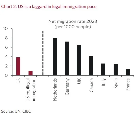 CIBC表示:“實際GDP年均增長率可能比原有人口趨勢下的水平放緩0.7至0.9個百分點。“Shenfeld在相關播客節目中提到,若驅逐移民加速,可能只需每月新增2萬個就業崗位就能維持失業率穩定。他補充説,隨着經濟影響顯現,未來可能出現支持擴大合法移民規模的政治空間。