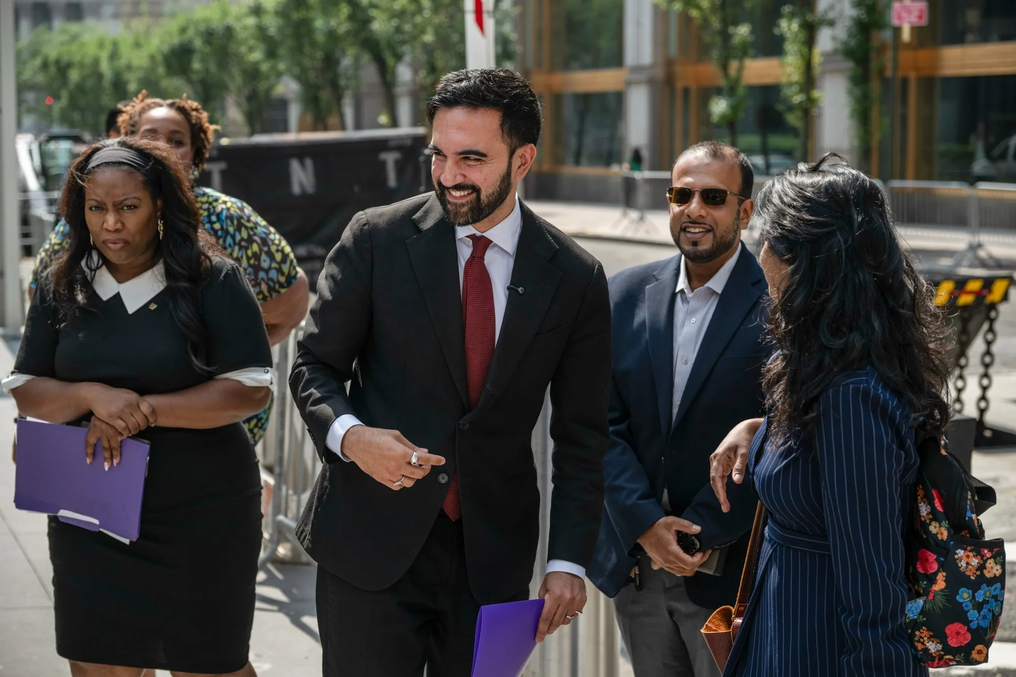 紐約市長候選人佐蘭·馬姆達尼(中)攝影師:維克多·J·布魯/彭博社“金錢流向權力。商界必須學會如何適應這個人。” ——紐約大學城市政策教授米切爾·莫斯, 評論佐蘭·馬姆達尼在市長候選人與摩根大通首席執行官傑米·戴蒙及其他企業領袖會面後。