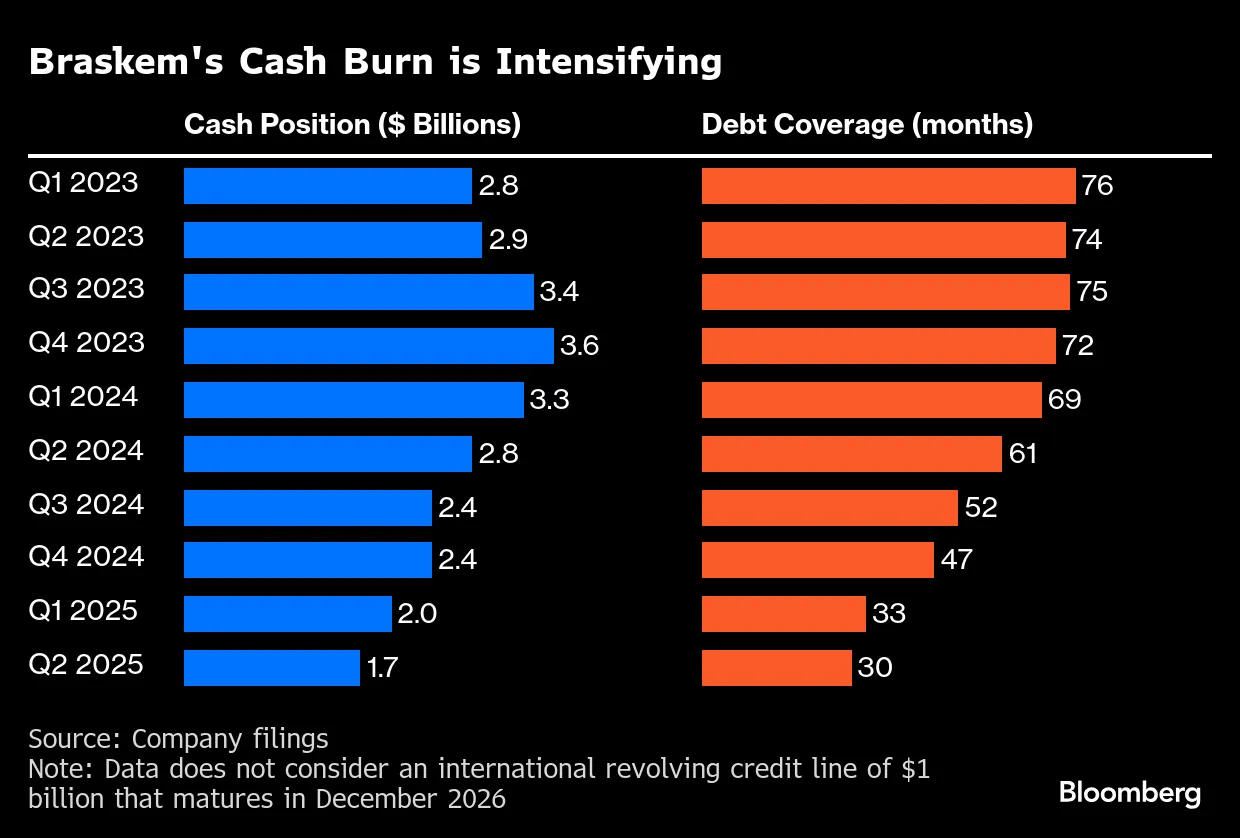 由於"令人沮喪"的財報顯示持續現金消耗與債務水平攀升,穆迪和惠譽本月先後下調了這家巴西企業的信用評級。僅第二季度,Braskem就燒掉了14.5億雷亞爾現金。