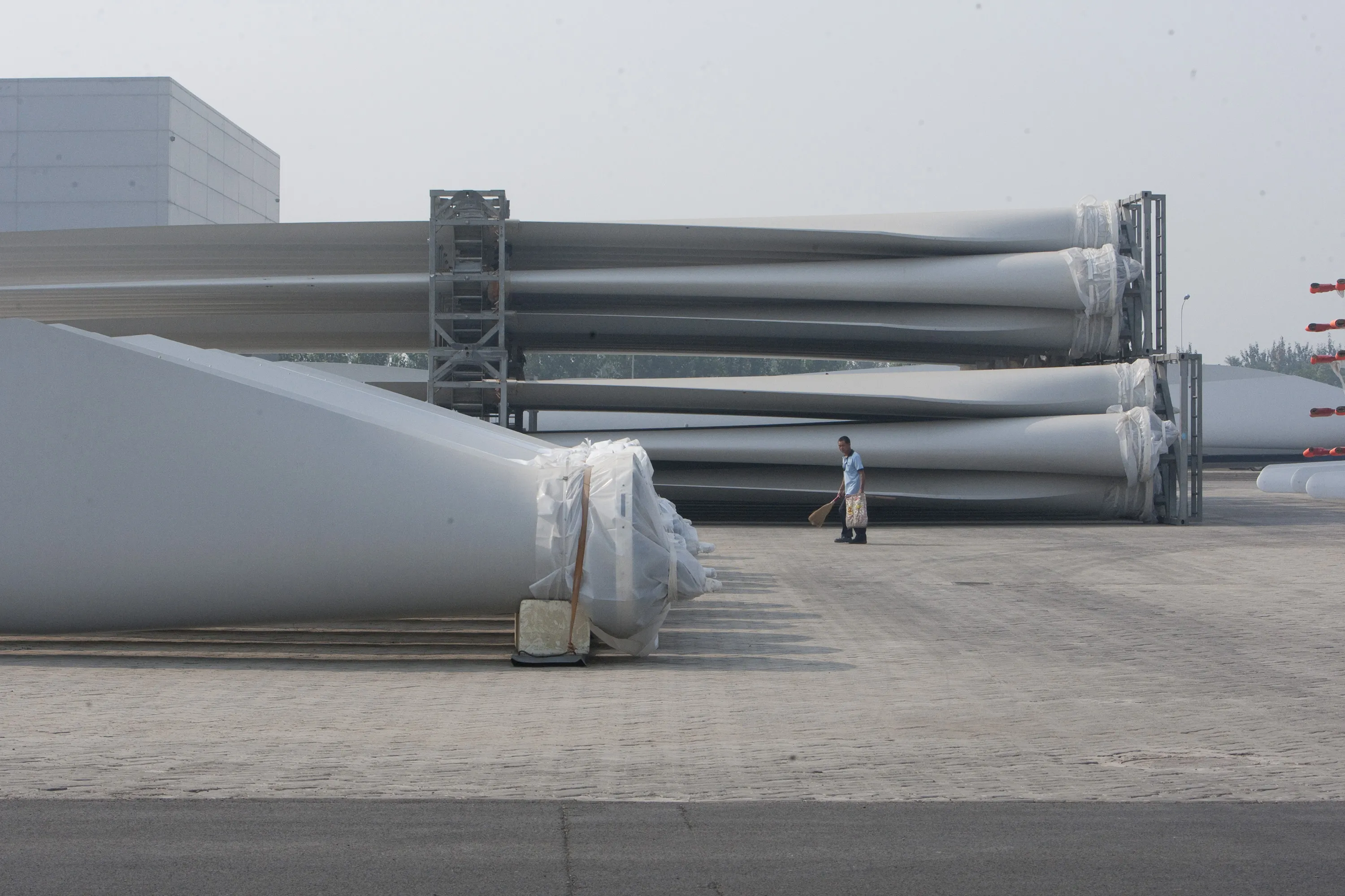 中國某工廠的風力渦輪機葉片。攝影師:Nelson Ching/彭博社特朗普政府已對進口風力渦輪機及零部件展開調查,這可能是對清潔能源組件加徵關税的前兆。