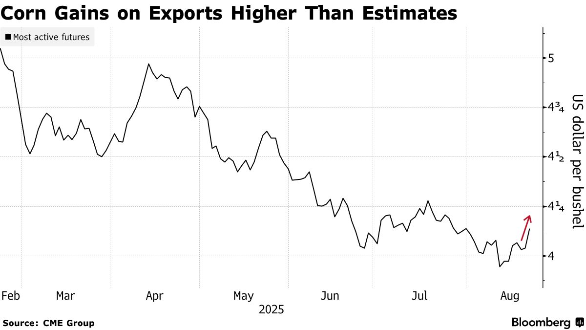 根據美國農業部的數據,在截至8月14日的一週內,美國出口了280萬噸玉米,是去年同期的兩倍,並且超過了彭博彙編的分析師最樂觀的預測。美國產大豆銷量也超過了最高預估,達到114萬噸。