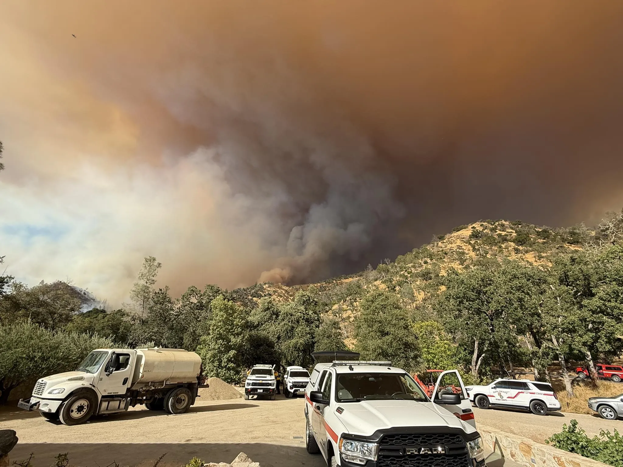 據加州林業與消防局通報,皮克特火勢在納帕谷葡萄酒產區的乾燥丘陵植被中迅速蔓延至1045英畝。州政府監控畫面顯示,俯瞰卡利斯托加的山脈一側騰起巨大煙柱。