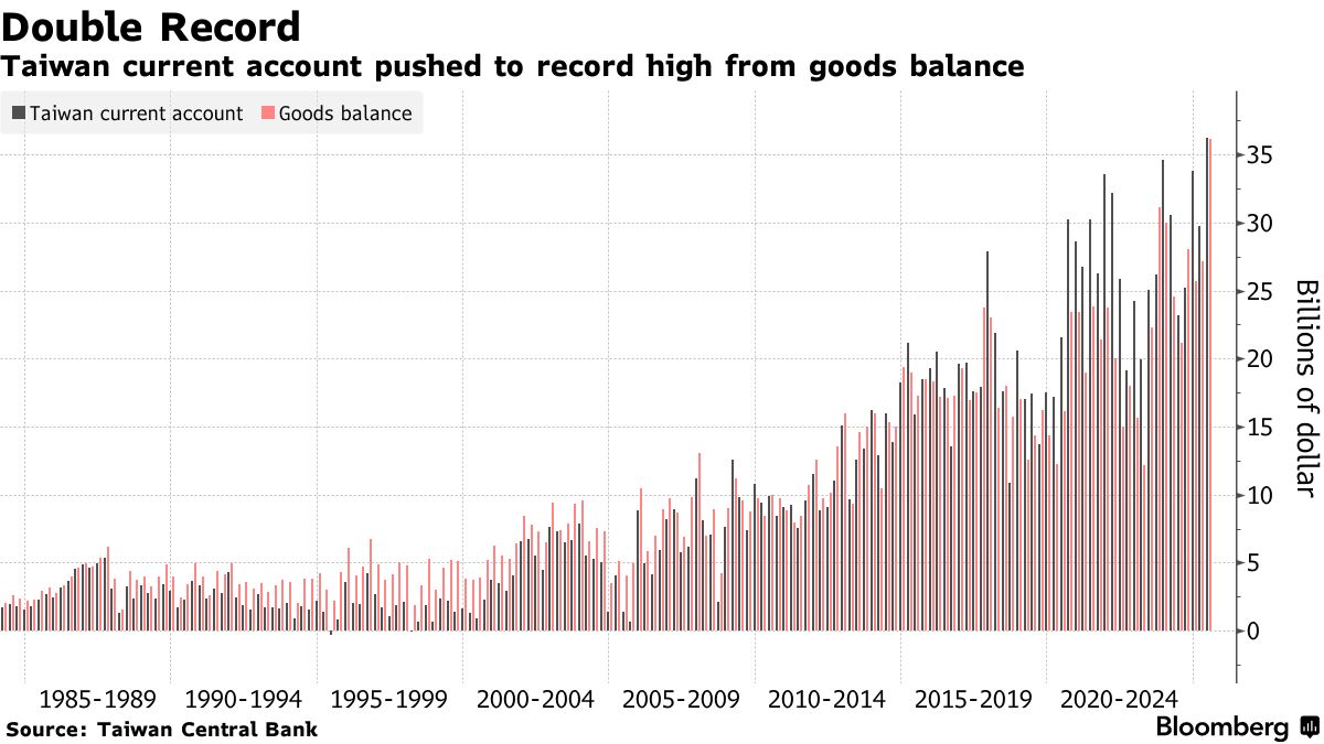 另一方面,在強勁的科技出口支撐下,台灣地區經常賬户盈餘在第二季度達到362.3億美元,創下新高。同期貨物貿易順差也刷新紀錄。