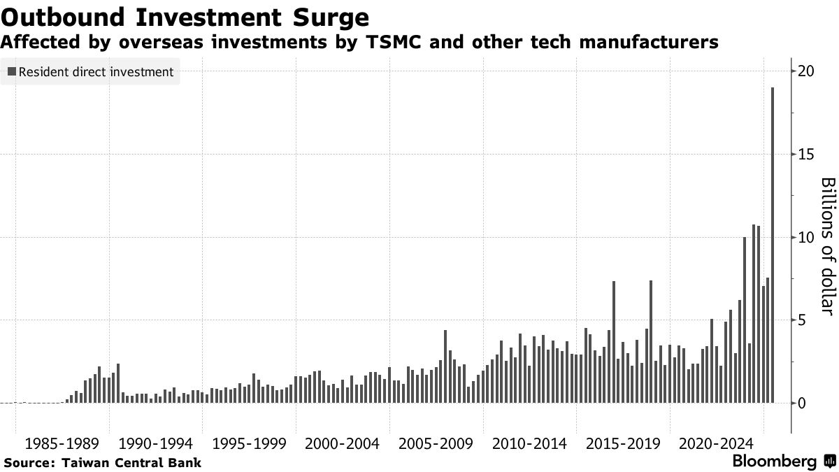 央行指出,台灣地區主要科技企業加速海外佈局,部分增長源於台積電等企業響應全球供應鏈調整,增加了對美國等地區的直接投資。