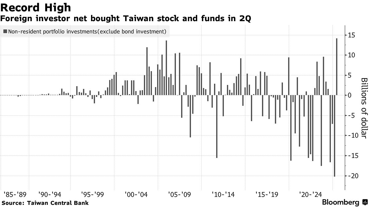 第二季度外資對台灣資產的淨投資增加141億美元,創歷史新高。主要推動因素是外資增持台股。